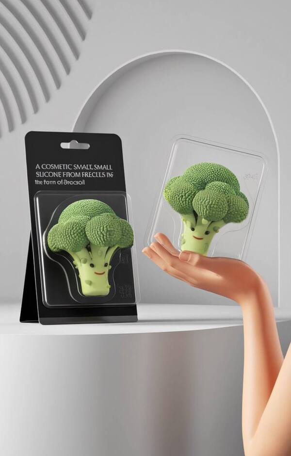 Promt: A 3D render of a white minimalist background with a black cardboard stand. There is a transparent package containing a small silicone sponge. The sponge has the shape of a broccoli and is designed to remove freckles. A girl is holding the package in her hand. There is a text «A cosmetic small silicone sponge from freckles in the form of broccoli».