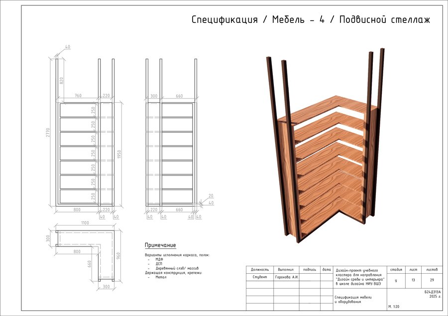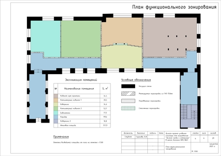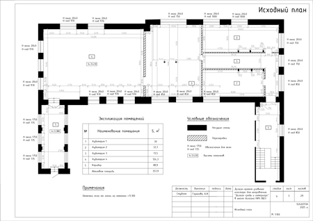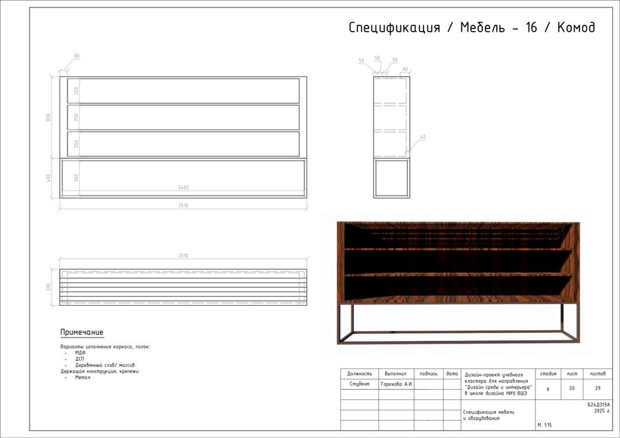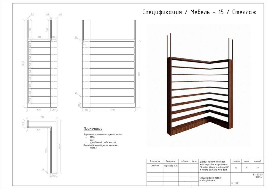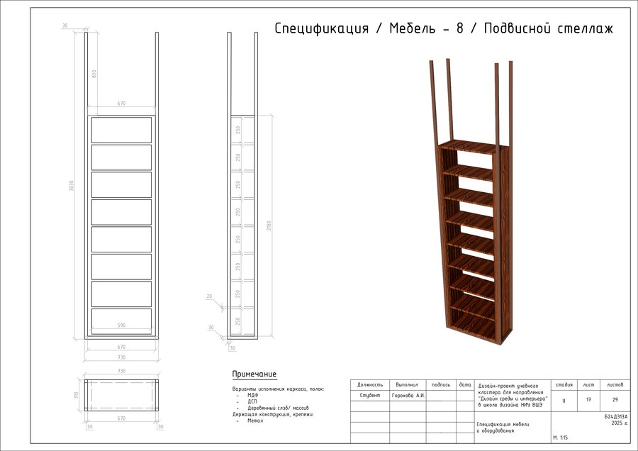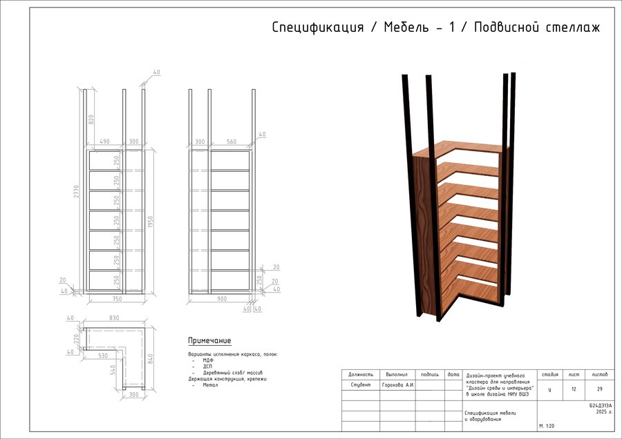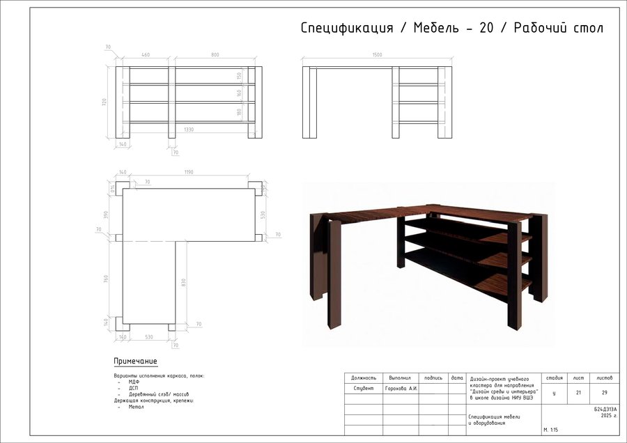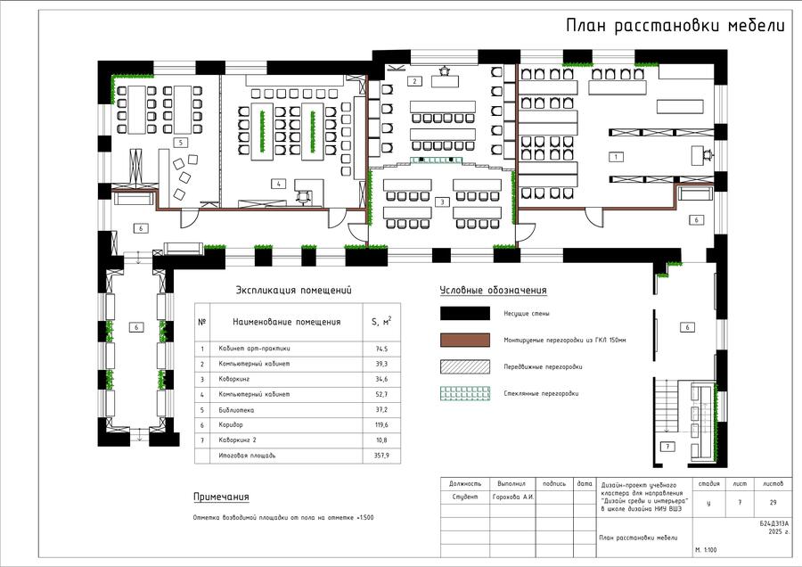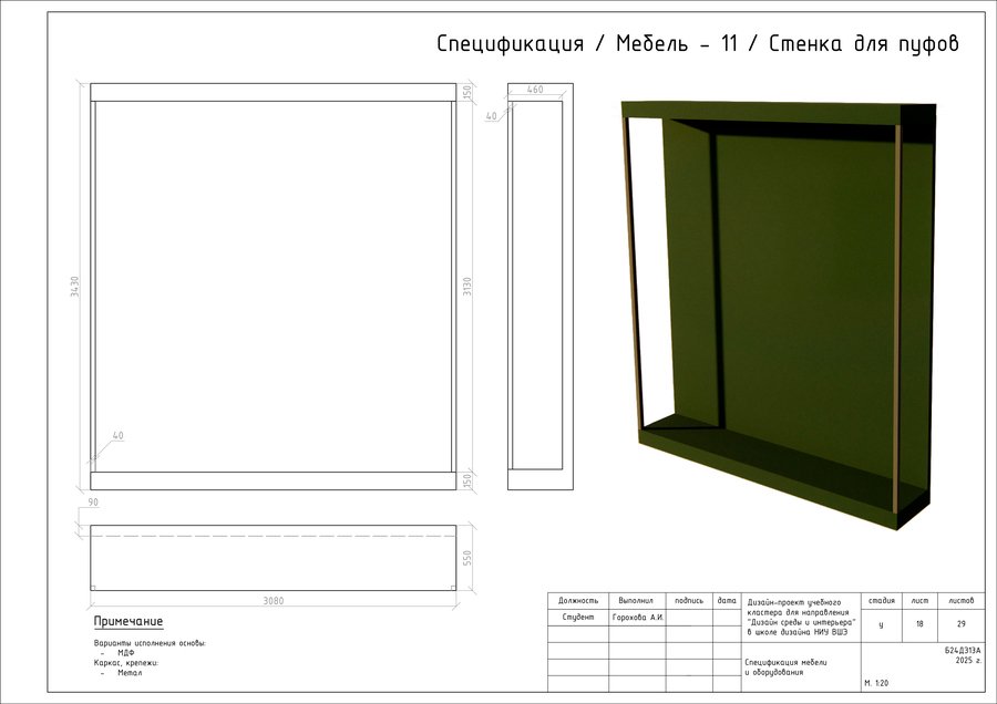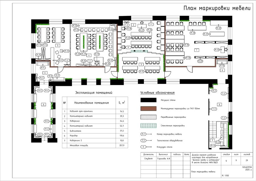Проект представляет собой альбом чертежей, созданный по итогам освоения курса «Основы цифрового черчения». Содержит исходный план, план демонтажа, возведения перегородок, зонирования, расстановки мебели и оборудования, габаритных размеров мебели и оборудования, маркировки мебели, а также таблицы спецификации мебели и оборудования и чертежи мебели на заказ для проекта Кластера Дизайна интерьера НИУ ВШЭ.