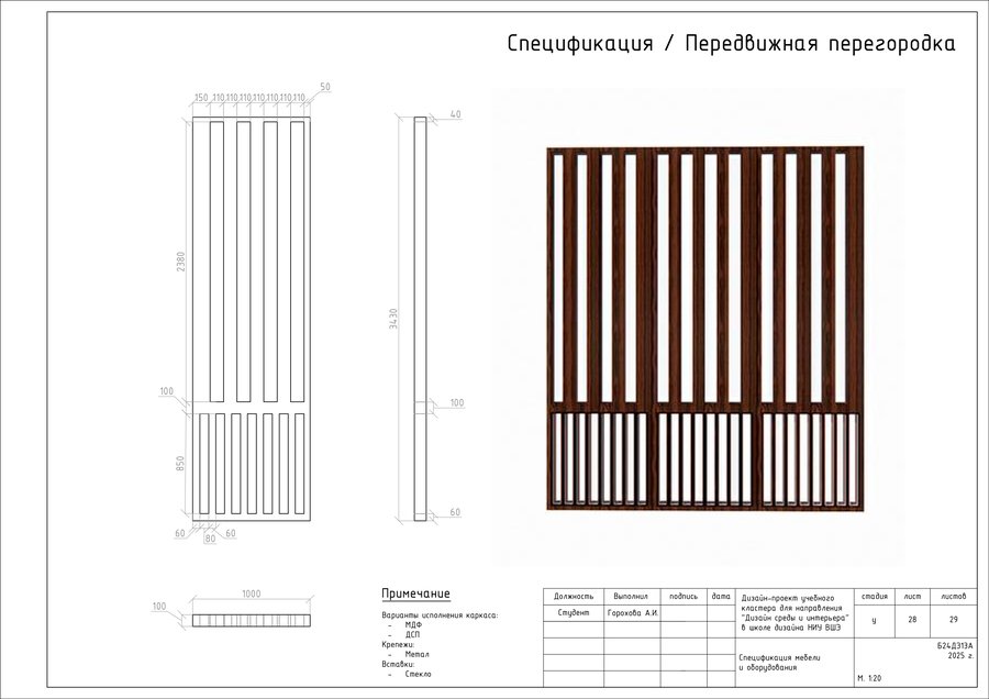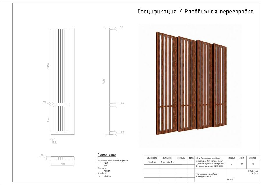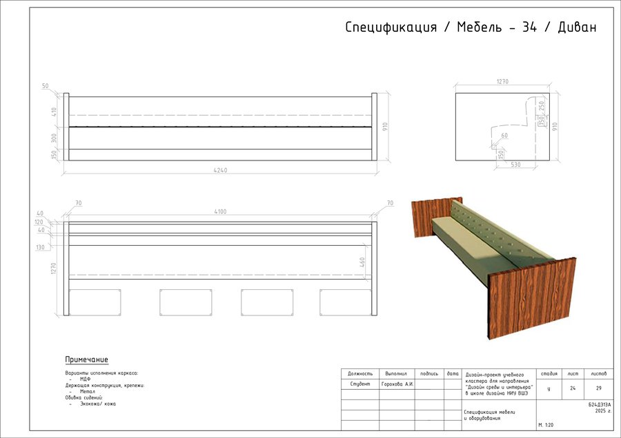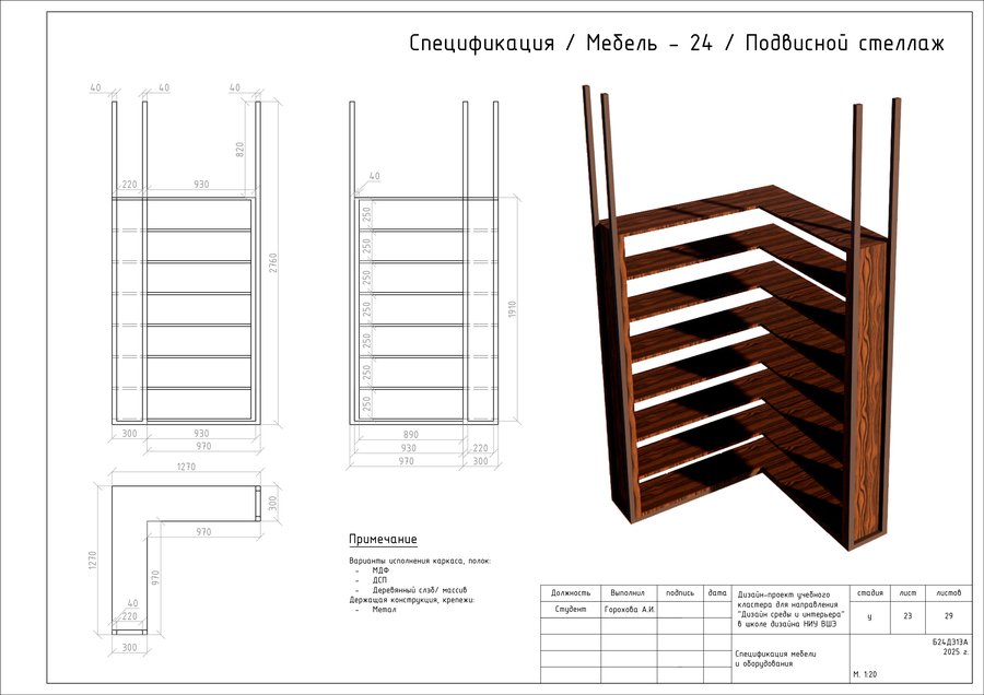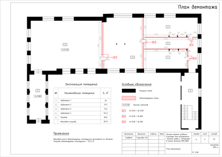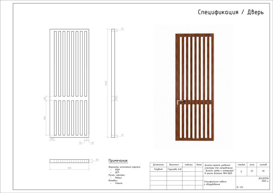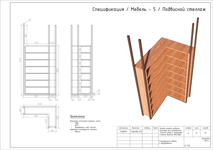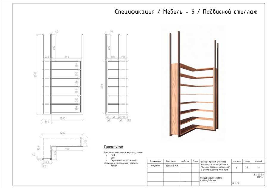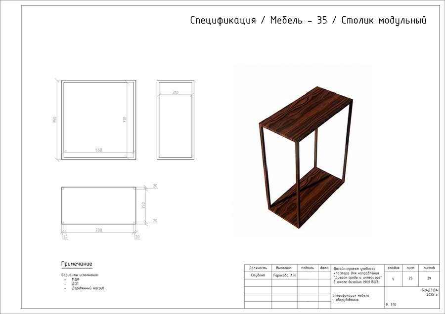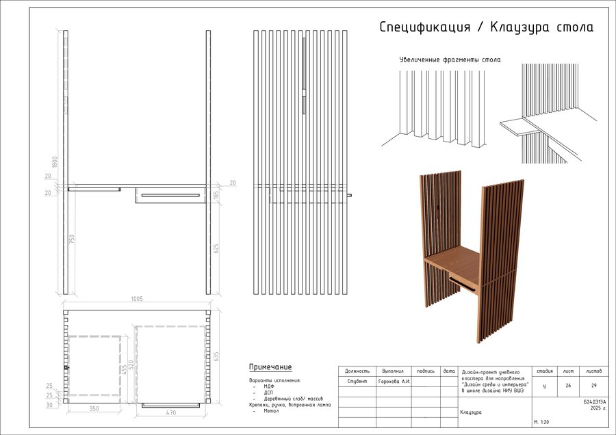Проект представляет собой альбом чертежей, созданный по итогам освоения курса «Основы цифрового черчения». Содержит исходный план, план демонтажа, возведения перегородок, зонирования, расстановки мебели и оборудования, габаритных размеров мебели и оборудования, маркировки мебели, а также таблицы спецификации мебели и оборудования и чертежи мебели на заказ для проекта Кластера Дизайна интерьера НИУ ВШЭ.