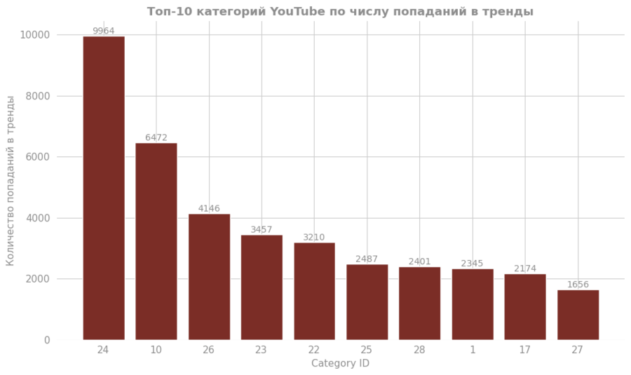 Этот график демонстрирует, какие категории видео чаще всего оказываются в разделе Trending на YouTube. Он основан на подсчете количества видео в каждой категории, что позволяет определить вероятность попадания контента определенного типа в тренды.