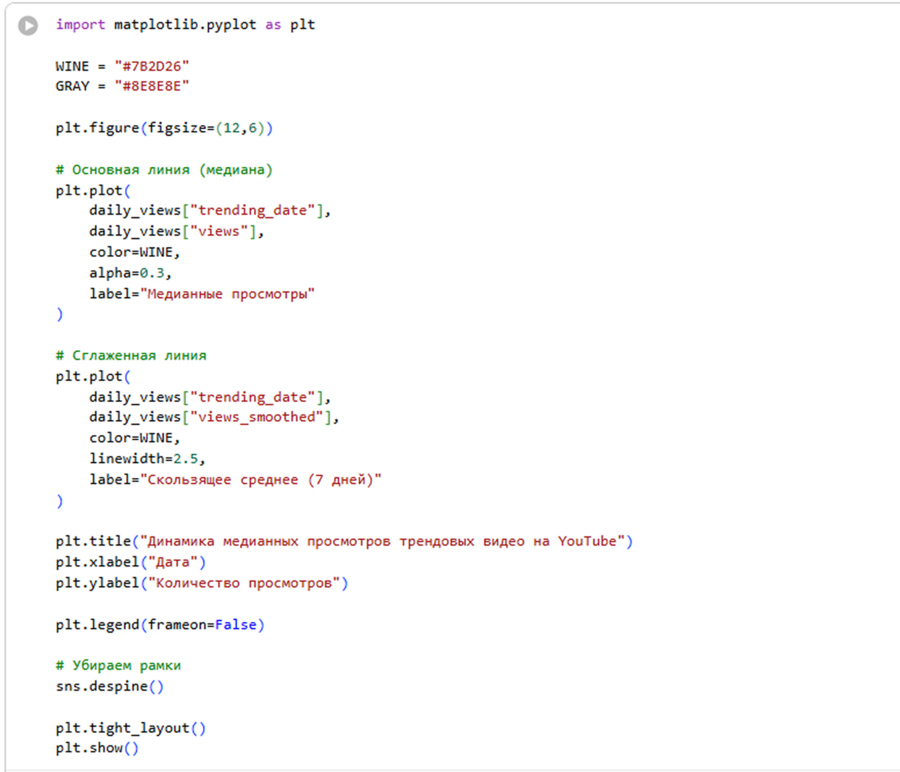 Для анализа временные данные были преобразованы в формат даты и сгруппированы по дням. Для каждого дня рассчитывались среднее и медианное число просмотров. Кроме того, применялось сглаживание данных с использованием скользящего среднего, что позволило снизить влияние резких колебаний и выбросов.