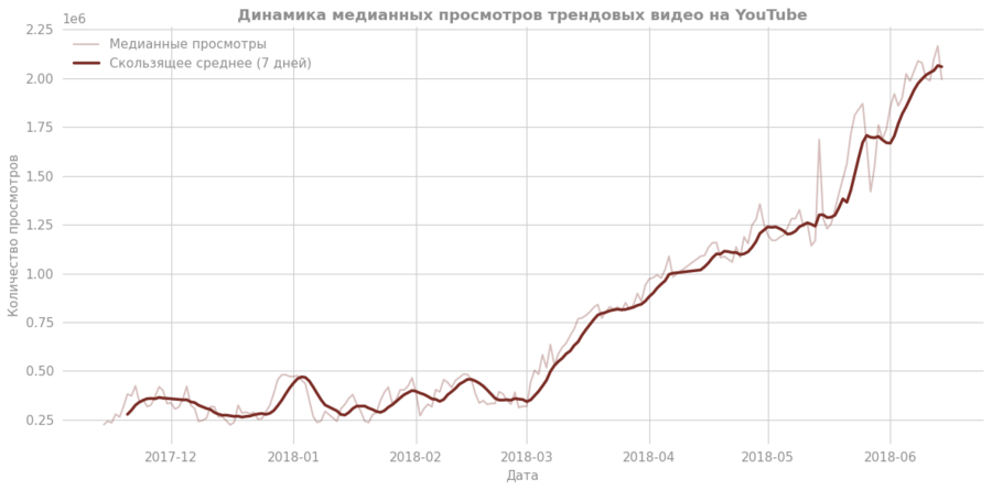 График показывает стабильный рост среднего числа просмотров трендовых видео с течением времени. Это свидетельствует о том, что конкуренция за внимание зрителей усиливается, и для того чтобы попасть в тренды, видео сегодня должно набирать гораздо больше просмотров, чем это было несколько лет назад. Использование медианы подтверждает, что этот рост является устойчивой тенденцией, а не результатом единичных вирусных всплесков. Таким образом, достижение популярности на YouTube становится всё более сложным и затратным процессом.