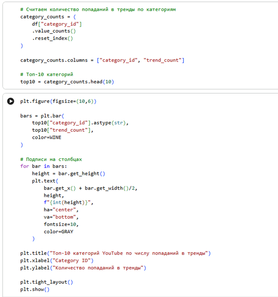 Сравнительный анализ видео по категориям проводился с использованием частотного анализа и распределения просмотров. Для этого применялись статистические характеристики, такие как медиана, межквартальный размах и выбросы. Это позволило оценить различия в структуре популярности между разными типами контента. Кроме того, был проведён текстовый анализ названий видео, основанный на частотности слов, для выявления наиболее распространённых лексических структур и эмоциональных триггеров в трендовом контенте.