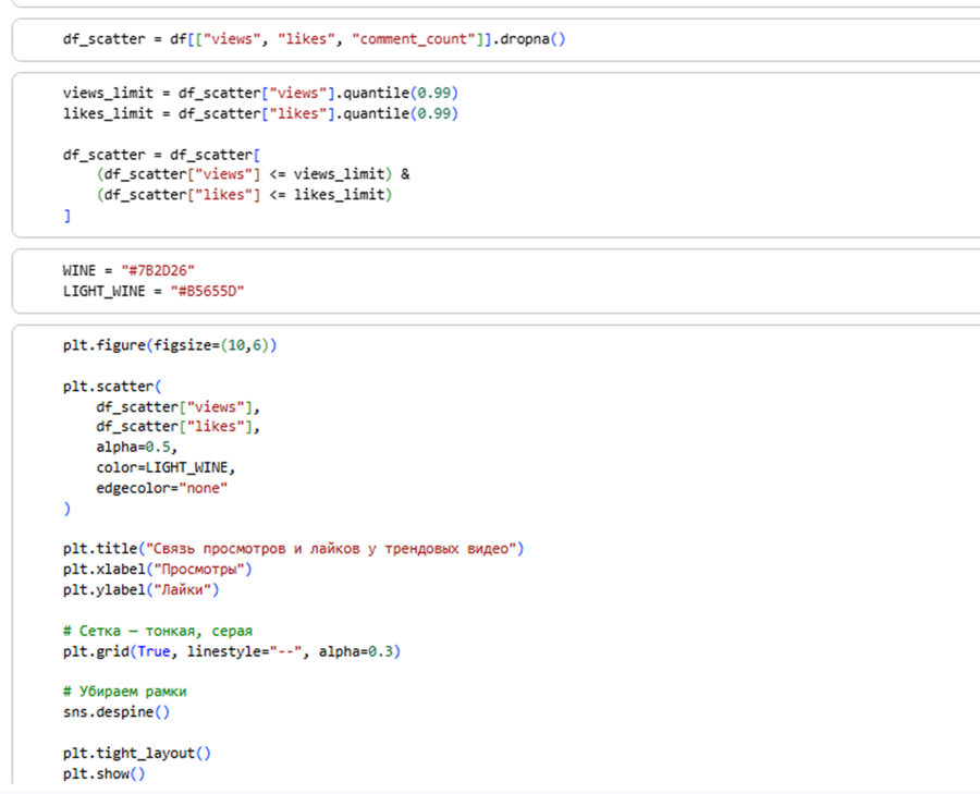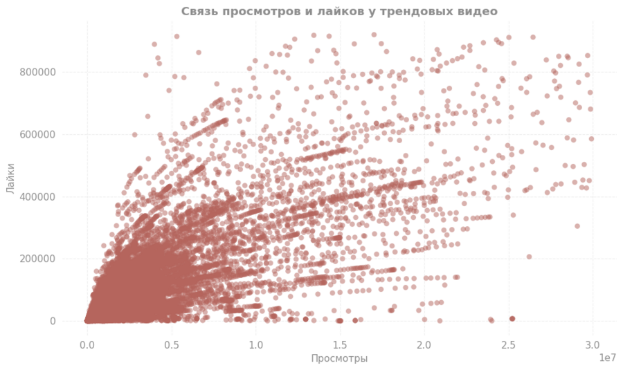 3. Scatter plot применялся для исследования связи между просмотрами и лайками. Такой тип визуализации позволяет выявлять корреляции, а также находить аномальные точки — видео, которые выбиваются из общей зависимости. Это важно для понимания того, всегда ли высокая популярность сопровождается высокой вовлечённостью.