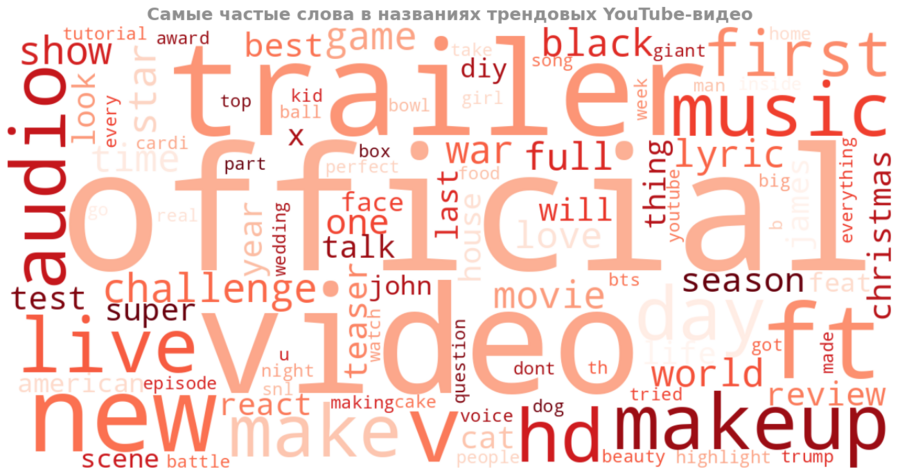 Этот график демонстрирует самые популярные слова в названиях популярных видео и помогает выявить языковые и эмоциональные особенности.