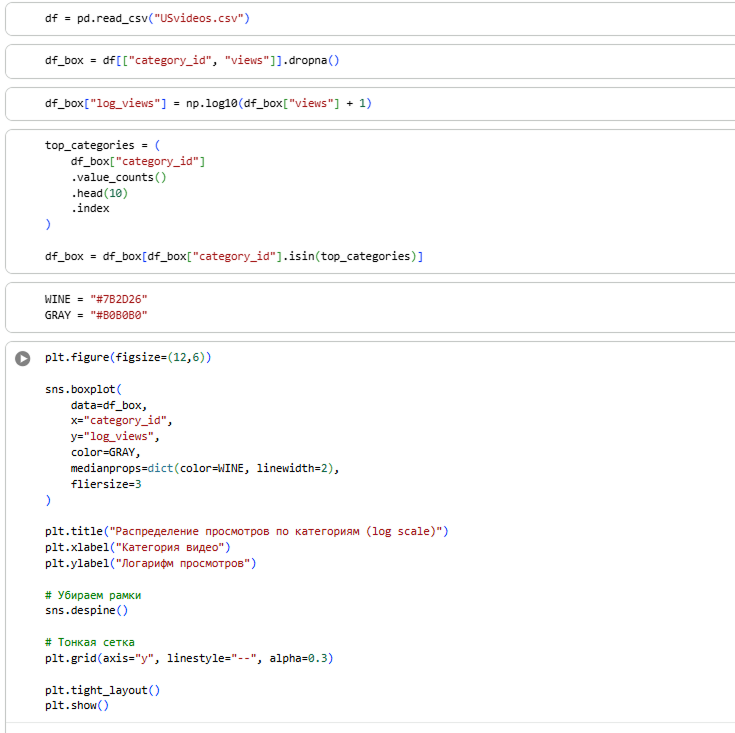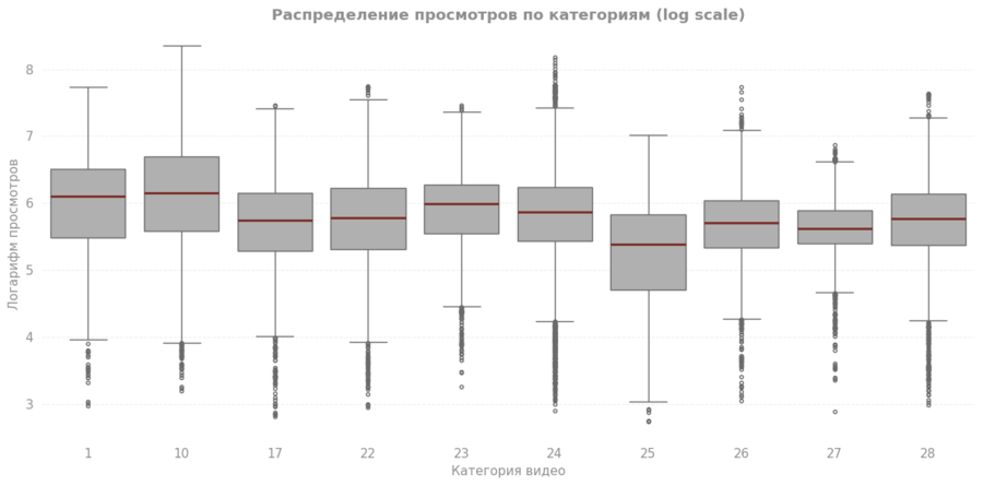 Для каждой категории были определены медиана, межквартильный размах и выбросы. Для обеспечения корректного сравнения данные о просмотрах были логарифмированы или очищены от экстремальных значений. Boxplot наглядно демонстрирует асимметрию распределений.