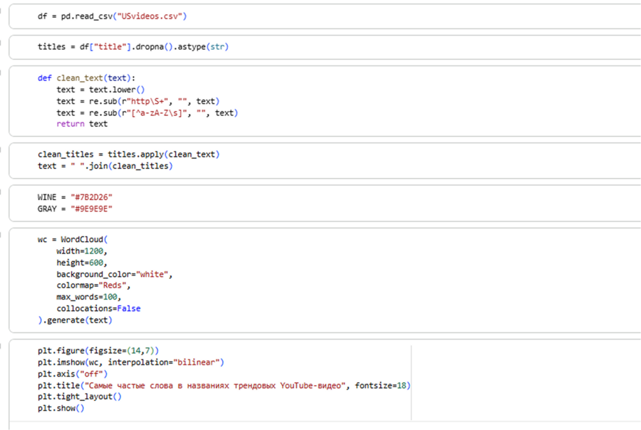 5. WordCloud был выбран для анализа названий видео, так как он позволяет визуально выделить наиболее часто используемые слова и увидеть языковые паттерны. Этот тип графика хорошо подходит для качественного анализа и помогает показать, какие лексические приёмы чаще всего используются в трендовых видео.