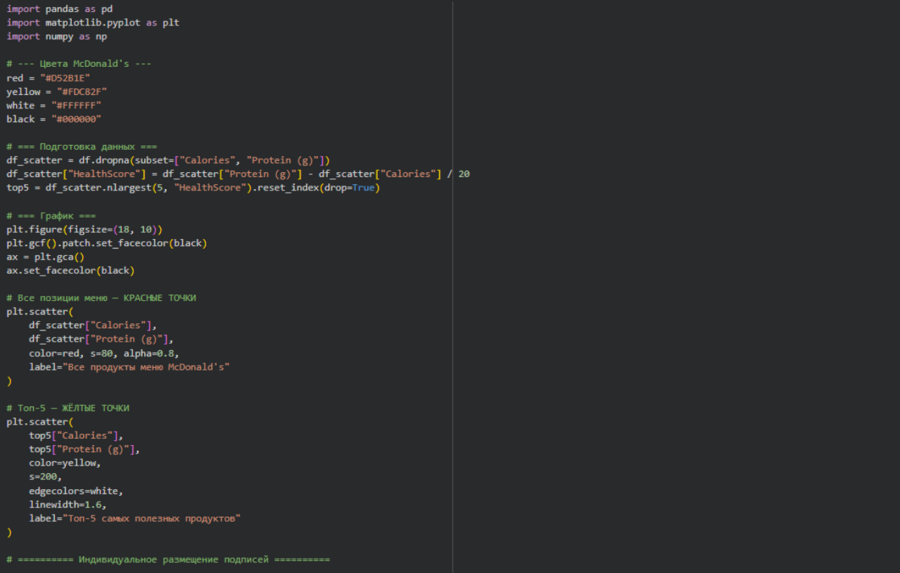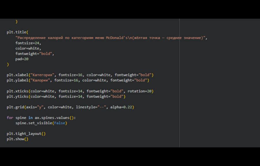 Проведённый анализ показывает, что меню McDonald’s является крайне неоднородным с точки зрения пищевой ценности. Наиболее калорийные позиции нередко представлены напитками и десертами, что противоречит распространённому представлению о том, что основная нагрузка приходится исключительно на бургеры. Распределение калорий по категориям демонстрирует важность размера порции и состава продукта, а анализ содержания сахара подчёркивает роль напитков как скрытого источника избыточной энергетической нагрузки. В то же время сопоставление калорий и белка показывает, что даже в рамках фастфуда существуют более рациональные варианты, выбор которых зависит от осознанного подхода.