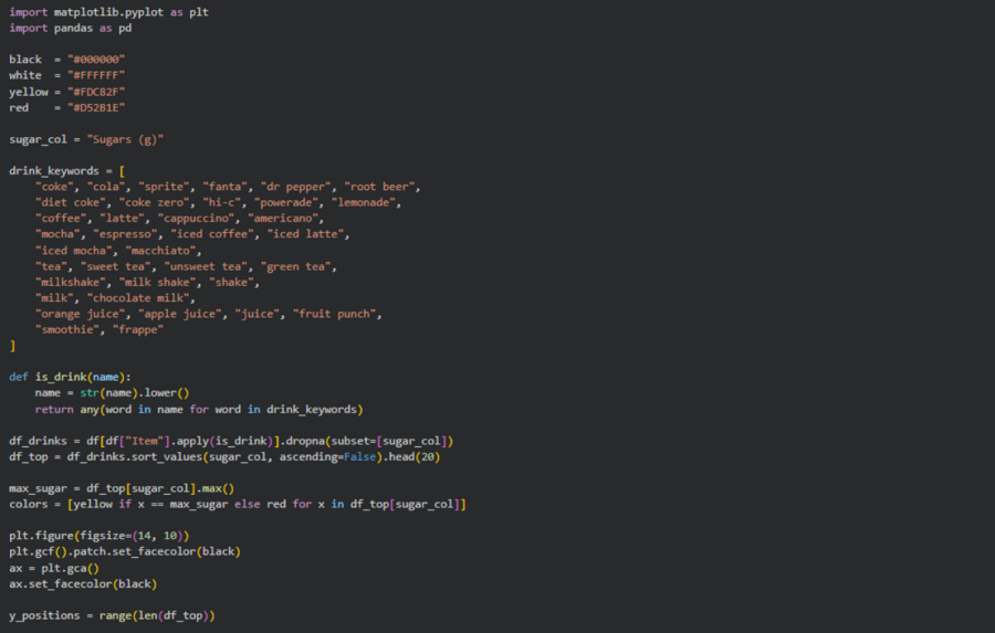 Третий график фокусируется на напитках и содержании сахара в них. Анализ показывает, что наибольшее количество сахара содержится в больших молочных коктейлях, причём увеличение объёма порции приводит к резкому росту показателя. Даже стандартные напитки содержат количество сахара, значительно превышающее рекомендованные суточные нормы.