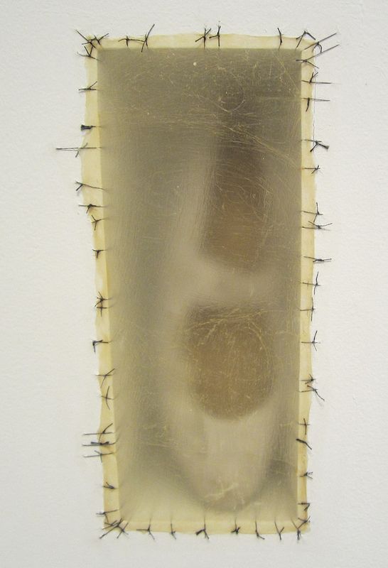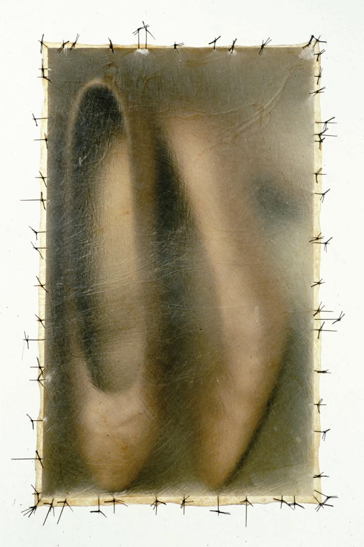 Грубые швы на коже подчеркивают жест насильственного закрытия — попытку «зашить» утрату, которая не поддаётся завершению.
