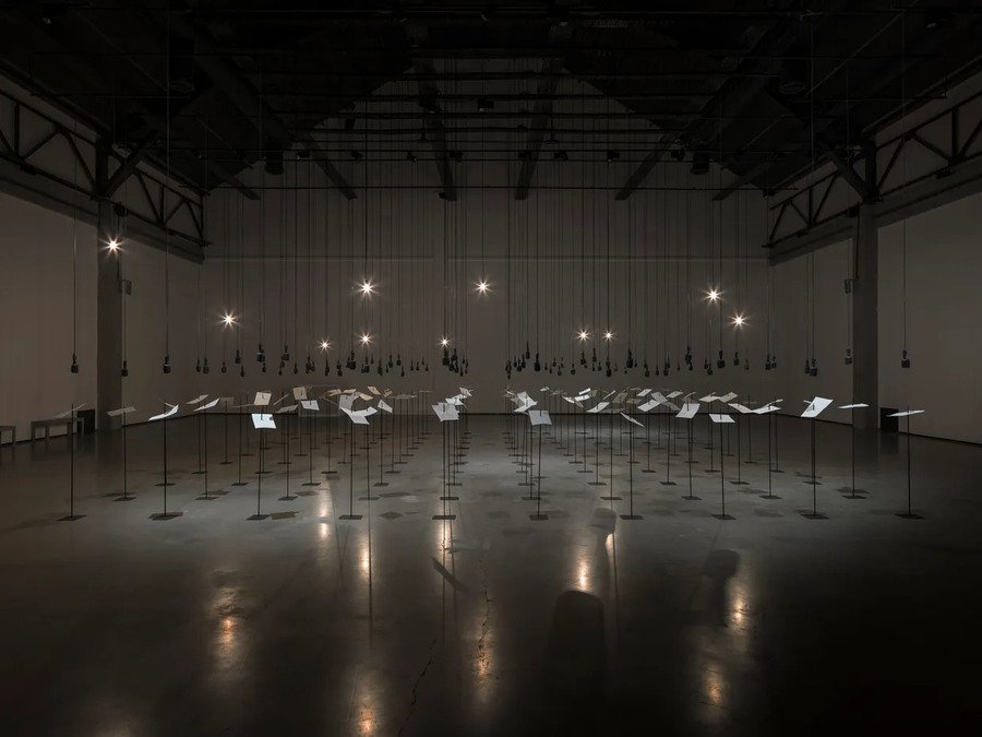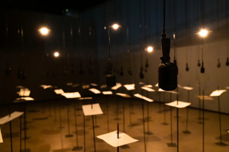 Шилпа Гупта, For, In Your Tongue, I Cannot Fit (2017–2018). Звуковая инсталляция с 100 динамиками, микрофонами, печатным текстом и металлическими подставками. Вид выставки: Шилпа Гупта, Sun at Night,