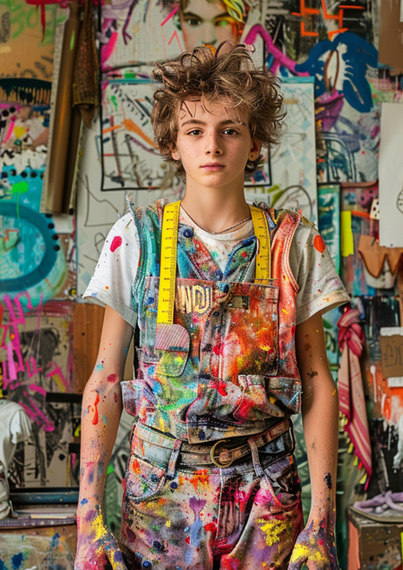 Create a portrait of an employee of the BUTTON atelier, which fully reflects the activity, creativity and naive audacity of school students. He is a young man, about 10-12 years old, with disheveled hair, as if they had no time to comb because of a lot of ideas. His clothes consist of a bright mix of various fabrics and homemade elements: a neon vest with poorly cut patterns, hand-painted trousers and sneakers with colorful marker drawings. He has a ruler around his neck and a pair of bright pencils or brushes behind his ears. You can see spots of paint on your face and a wide, slightly hooligan smile. His hands are stained with chalk, paint and thread, and in one of them he holds an incredible piece of cloth or scissors. The background should be just as creative: a chaos of bright materials, sketches, mannequins with homemade costumes and decorated boxes. The atmosphere of fun and creativity around a person feels like the spirit of a team in which everyone is like a friend and colleague. The student’s expression is proud and inspired.