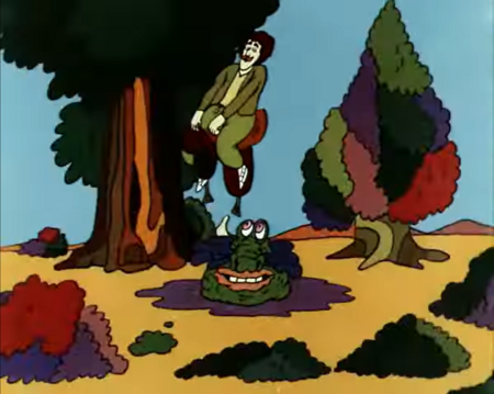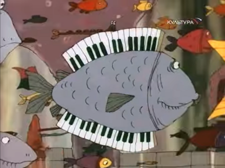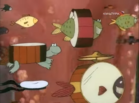 При этом Саакянц работает и со скоростью трансформаций. Иногда они настолько быстрые, что глаз не считывает все пройденные состояния. Возвращаясь к примеру с «Говорящей рыбой», мы видим, как используется этот прием в связке с повествованием. С другой стороны, Саакянц может и оставить вещь или персонажа (или вещь, которая становится персонажем) в промежуточном состоянии: в мультфильме «В синем море, в белой пене» мы видим морских обитателей, сросшихся с музыкальными инструментами, как будто бы застывшими в процессе превращения во что-то иное.