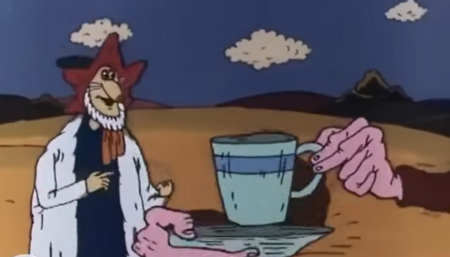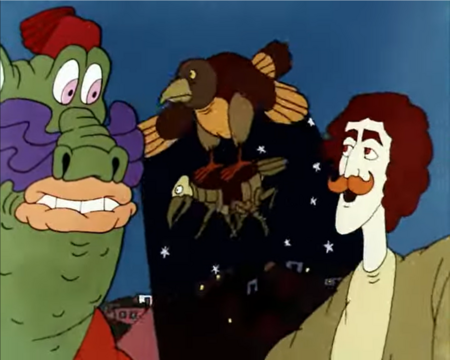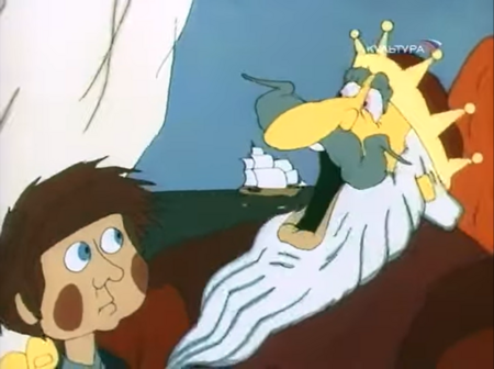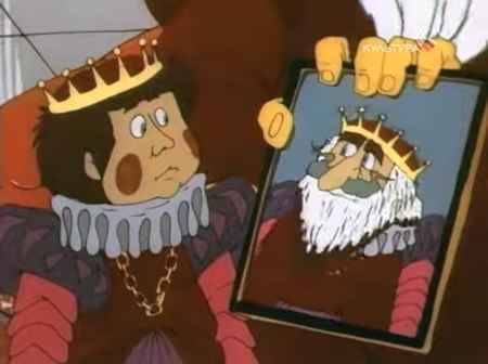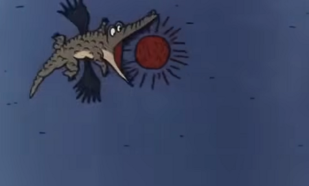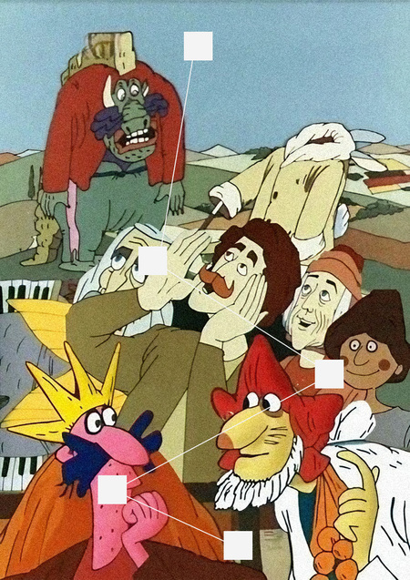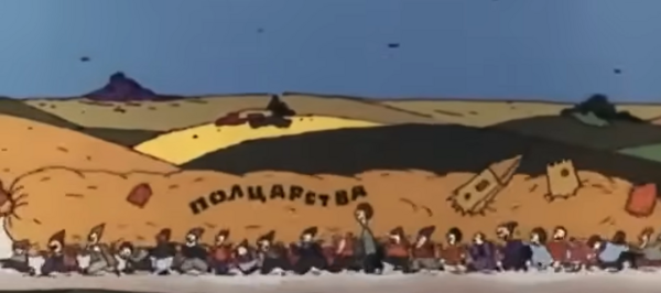 В итоге на экране зритель видит, как из воздуха возникают монстры, как великаны тонут в чашках, а крылатые крокодилы пытаются съесть солнца. Но самый интересный образ здесь — это те самые полцарства, которые герои Саакянца буквально кладут в мешок после того, как перехитрили царя; здесь мы видим, как старый элемент устной культуры визуализируется с помощью техник анимации, уникальных для этого режиссера.