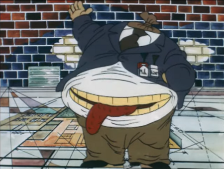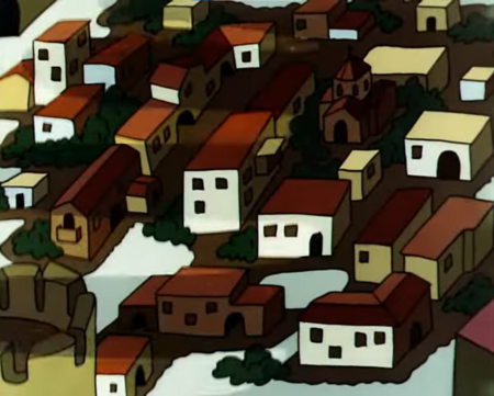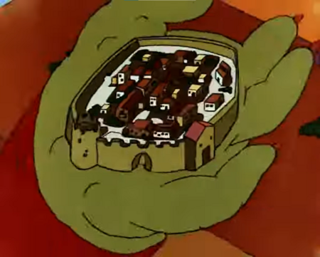 Другим частным случаем такой трансформации является смена крупности. Как мы уже упоминали, в мультфильмах армянского аниматора часто используется внутрикадровый монтаж: камера регулярно перемещается между крупными и общими планами, меняет ракурсы и направление движения. Эти изменения сопровождаются и изменением размера объектов: в кульминационной сцене «Говорящей рыбы» Саакянц визуализирует диалог героев, буквально сжимая город через отъезд камеры. Общий план с высоты птичьего полета моментально оказывается детальным, когда Э-эх помещает целый район себе в руку со словами: «город, небось, крохотный?»