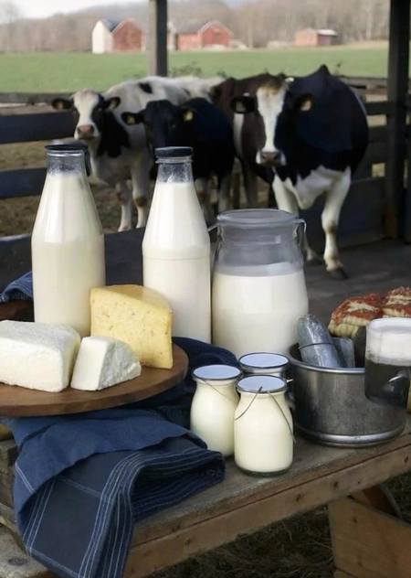 Генерация изображения Recraft; свой стиль Промпт: concise, modern, showcasing a range of premium dairy farm products, prepared by hand. The image conveys a sens. + логотип добавлен в Adobe Photoshop.