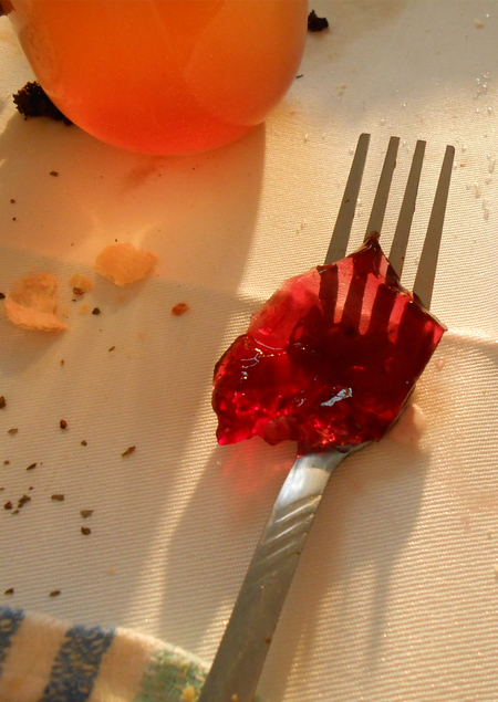 В процессе поиска в стенах студии натюрморт трансформировался от обыденности к сумбуру смешения продуктов сладкого и соленого завтраков, а новая скатерть и чистая посуда запечатлели эту градацию во времени.