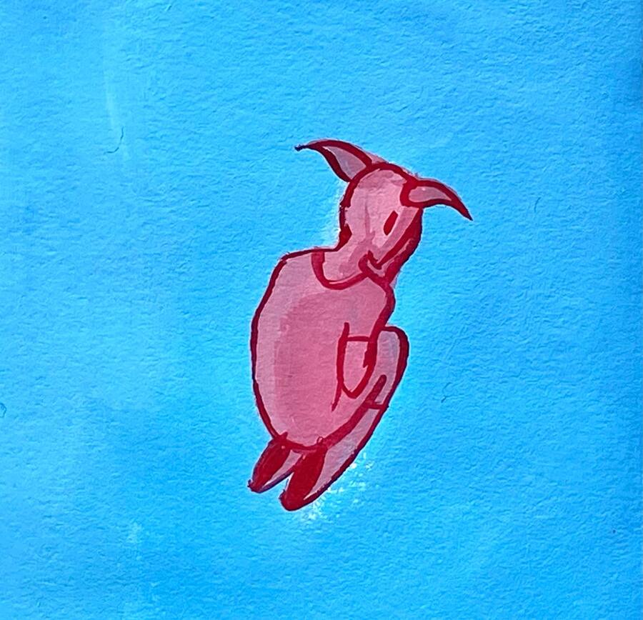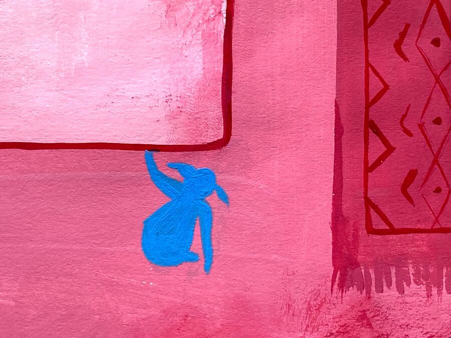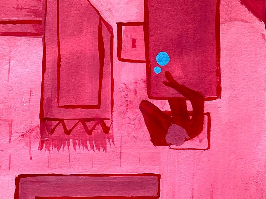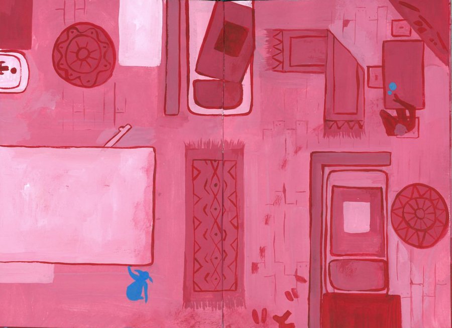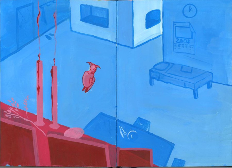 Цвет играет ключевую роль в моей работе. Синим обозначен тиран, а розовый — цвет жертвы. Работа выполнена темперой: такой же яркой краской, как восприятие детского взгляда на мир.