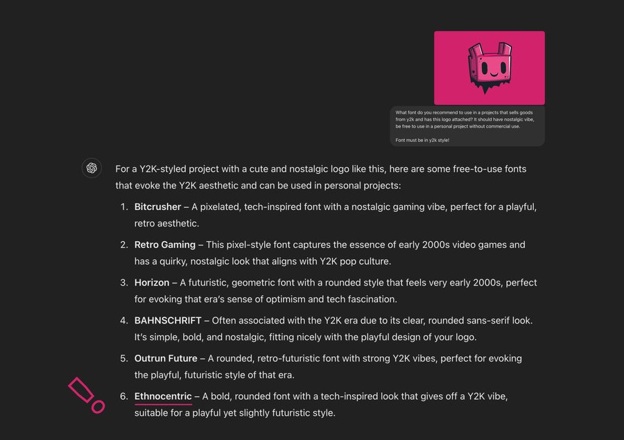 /imagine prompt: What font do you recommend to use in a projects that sells goods from y2k and has this logo attached? It should have nostalgic vibe, be free to use in a personal project without commercial use. Font must be in y2k style!