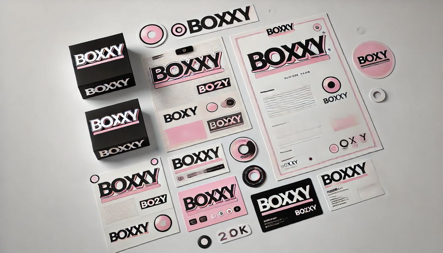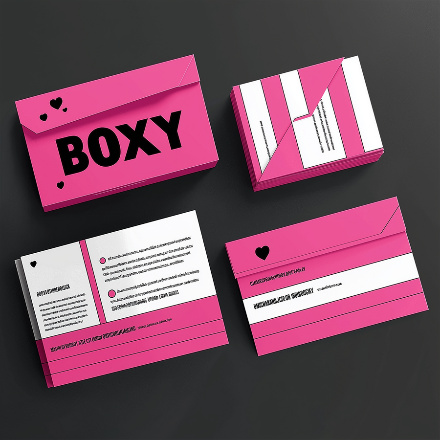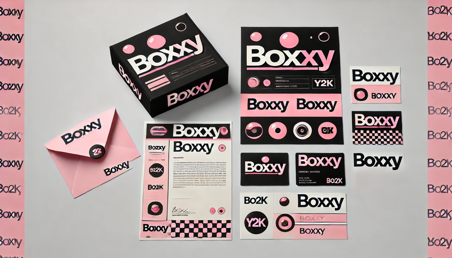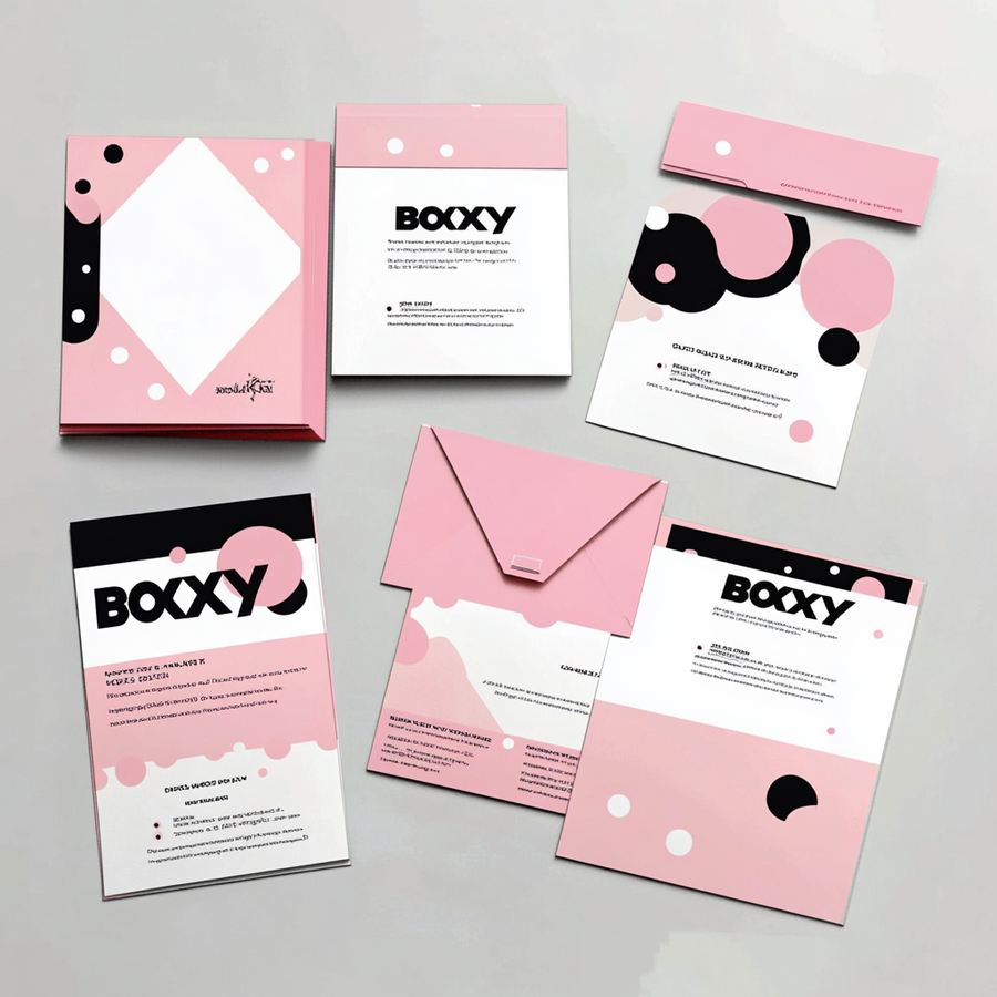 /imagine prompt: generate a mockup of printed materials (paper, envelope, business cards) on a white background for the BOXXY brand in 2000s style using pink, black, white colours. BOXXY must be written on every piece of the material. Add nostalgia vibe. Use images attached.