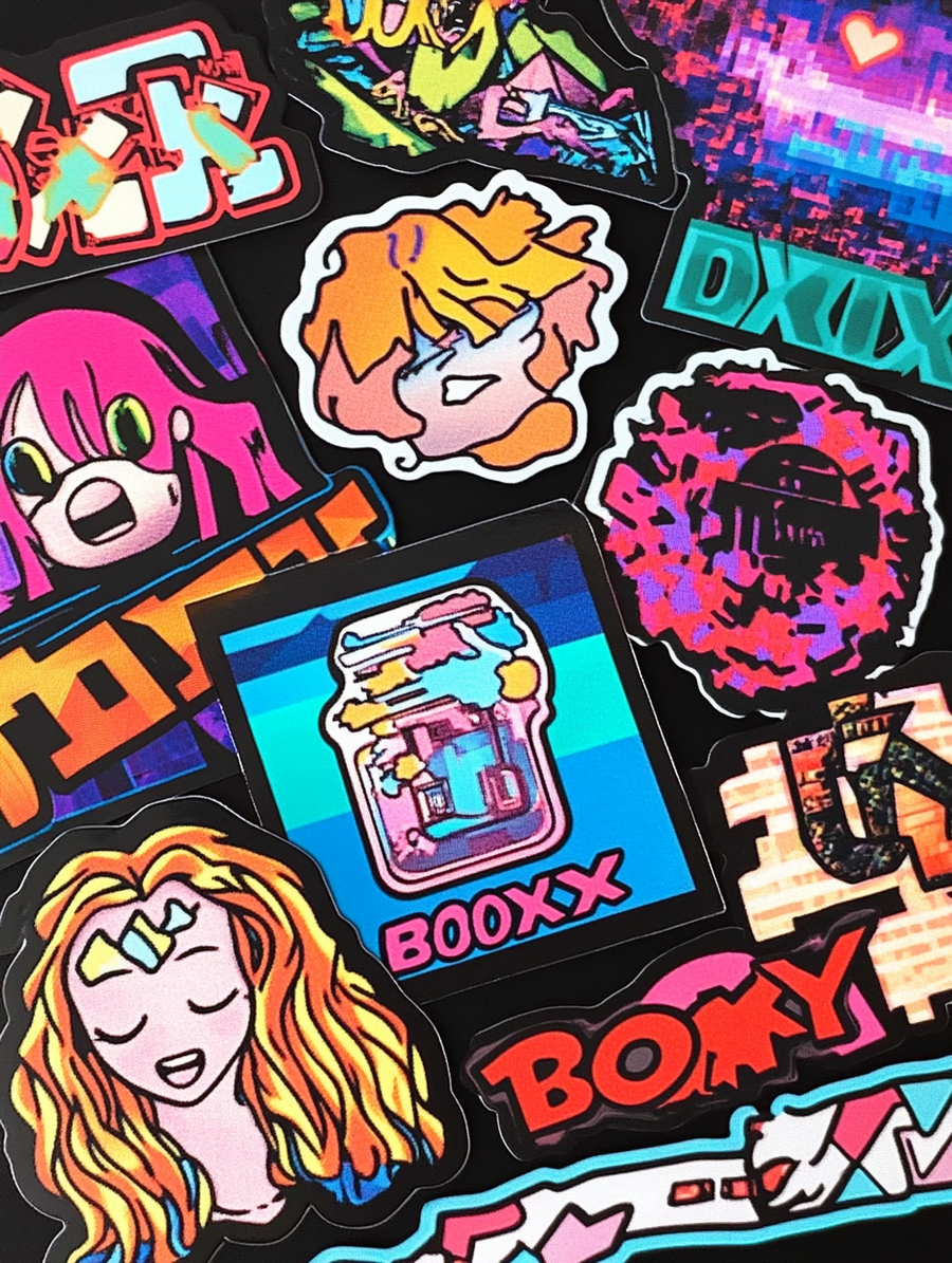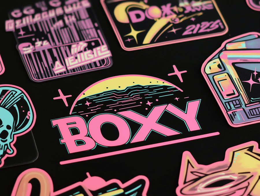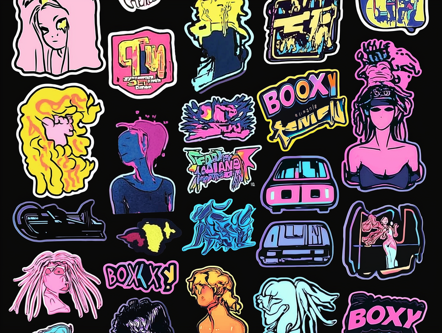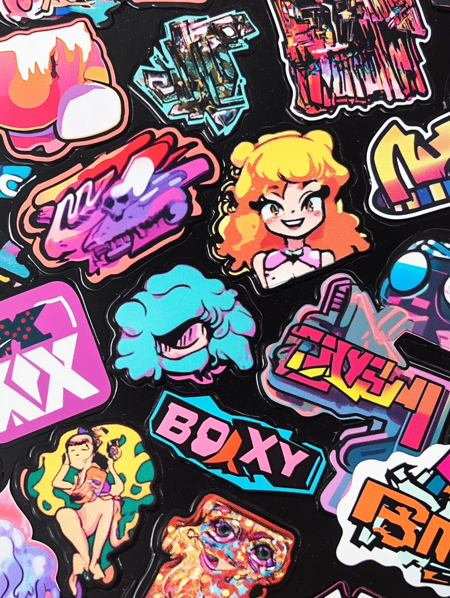 /imagine prompt: generate a variety of fancy 2000s style stickers for the BOXXY brand on a black background.