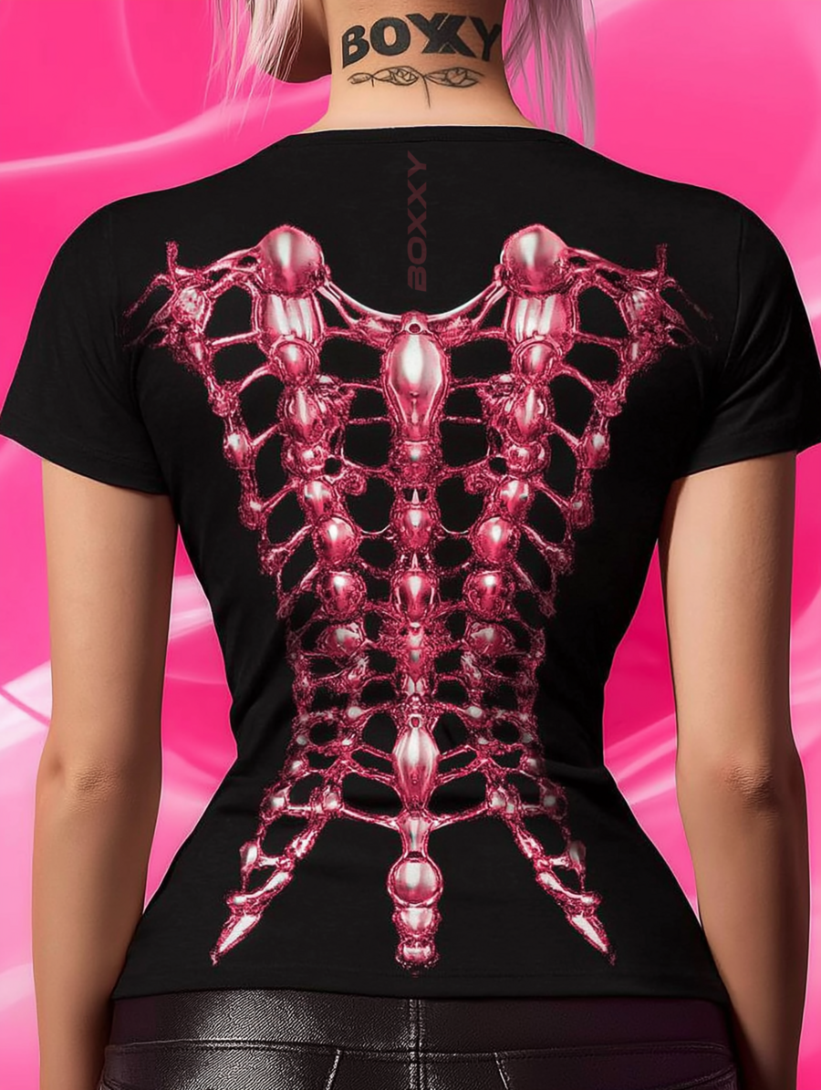 /imagine prompt: create BOXXY black brand t-shirt with image of corset that made out of pink metallic elements like on the image attached.