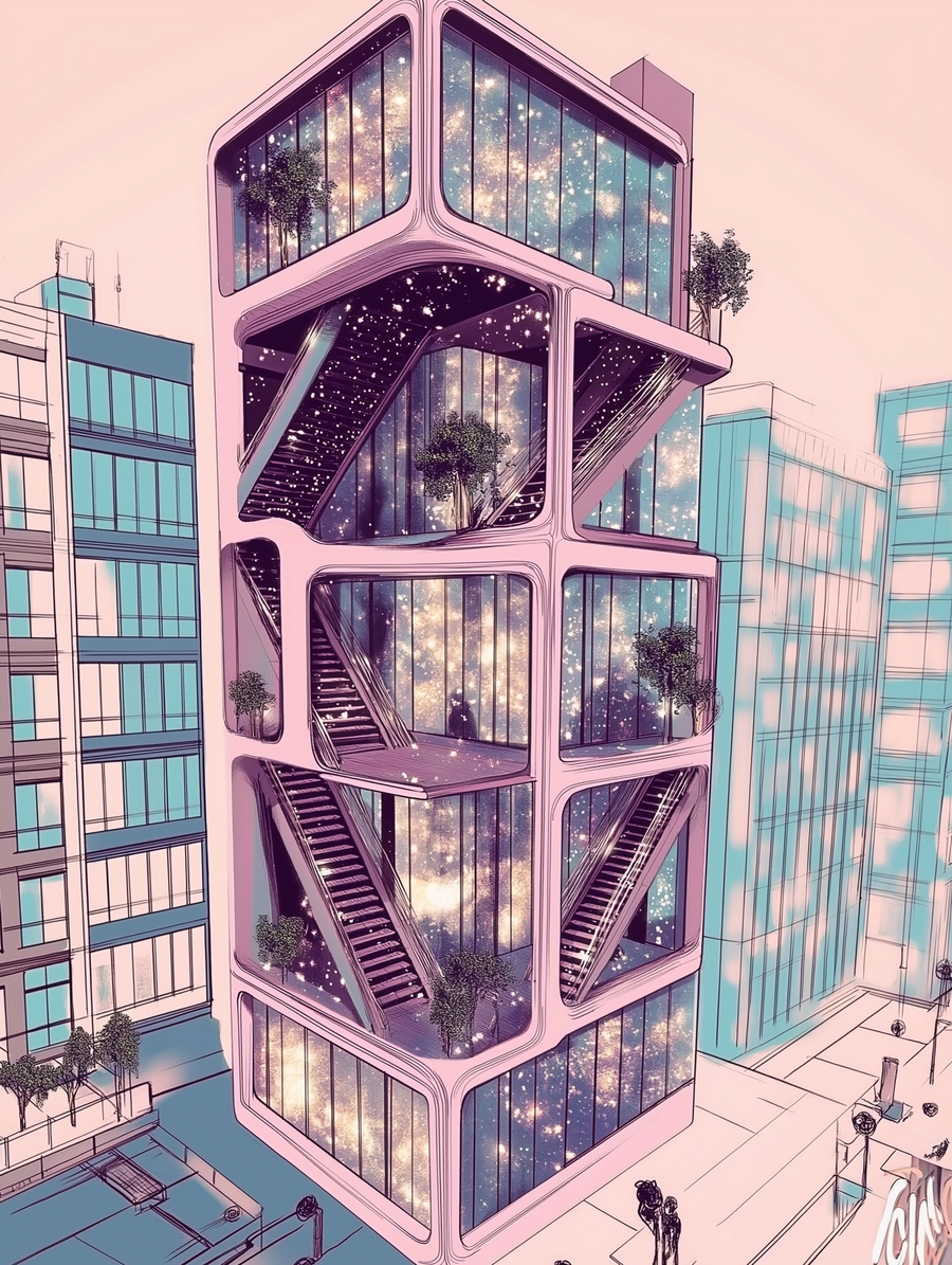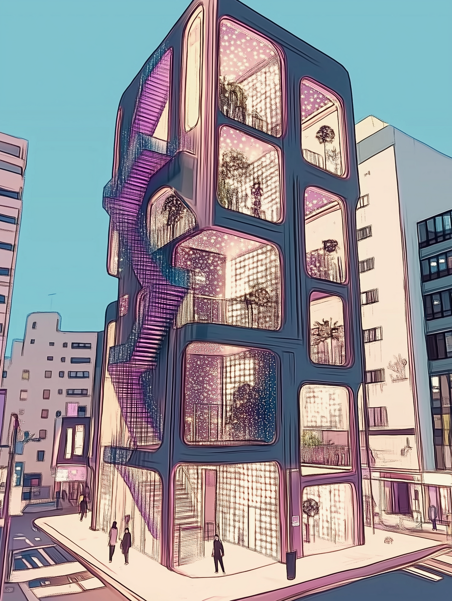 /imagine prompt: create a building in 2000s style that look like office. Pick attached images as inspiration. Building should be medium height, have a form of the box. It should be sparkly and shiny, in pink or purple colours. Keep 2000s girlish aesthetic.