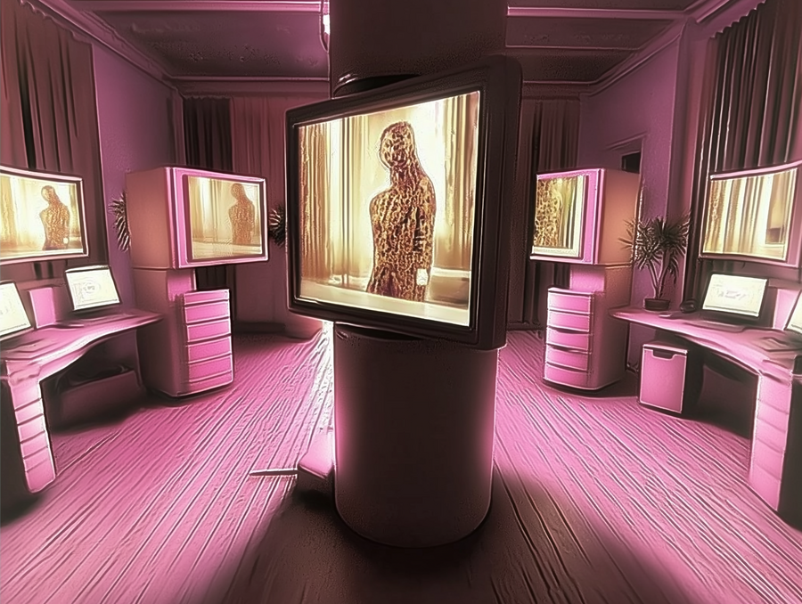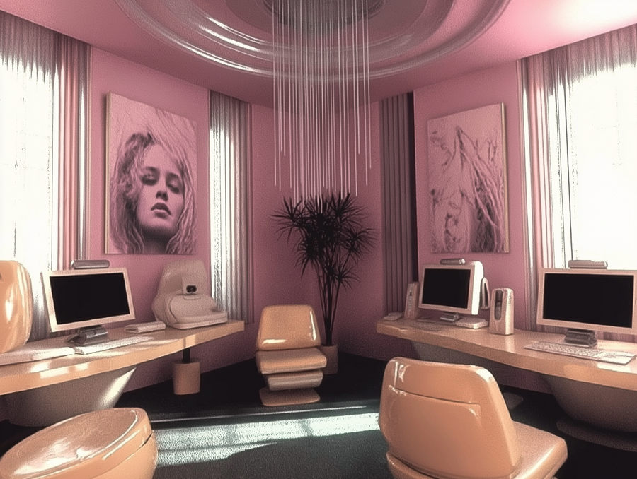 /imagine prompt: create an office with pinky 2000s style interior design using images attached.