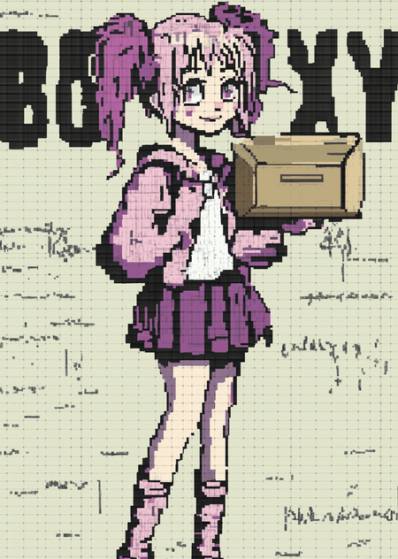 /imagine prompt: A captivating 2000s inspired advertising poster for BOXXY (brand selling y2k vibe goods). The photo features a box that has BOXXY written on it. There should be a lot of extra pink and black details. The background is a collage of barbie inspired shapes and forms. The poster is printed on high-quality paper, with pixelated typography stating ’BOXXY». Use images attached to get right style.