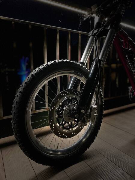 Далее дело было за колесами и тормозами. Обычно тормозные роторы на велосипедах бывают 150 мм — 200 мм. Здесь же, передний тормозной диск — 300 мм. Тормоза от той же хонды. Редкие покрышки Nokian, шириной 3 дюйма, в то время как обычные бываютвсего лишь 1-2 дюйма.