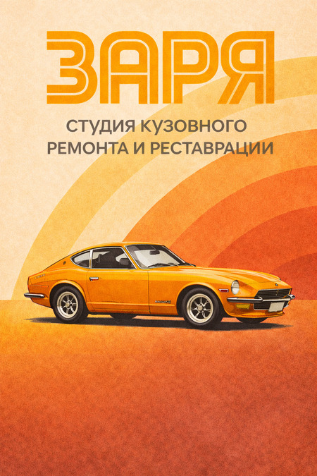 Промт: vertical poster size a3 in the company’s retro style. On the poster, a car is driving along the road. The brand name zarya is on top. Put a poster on the garage door.