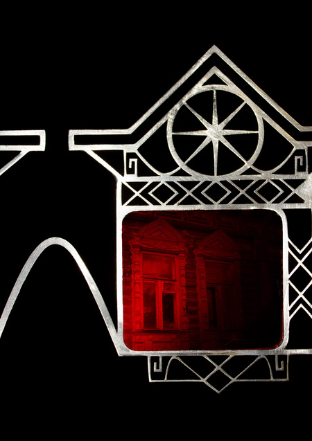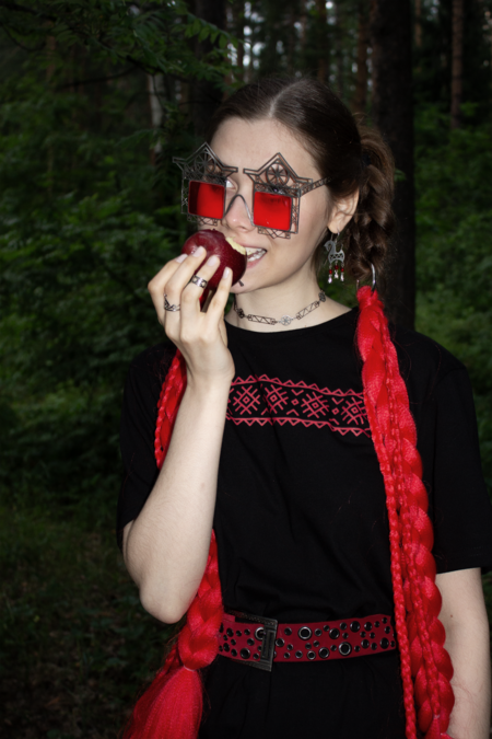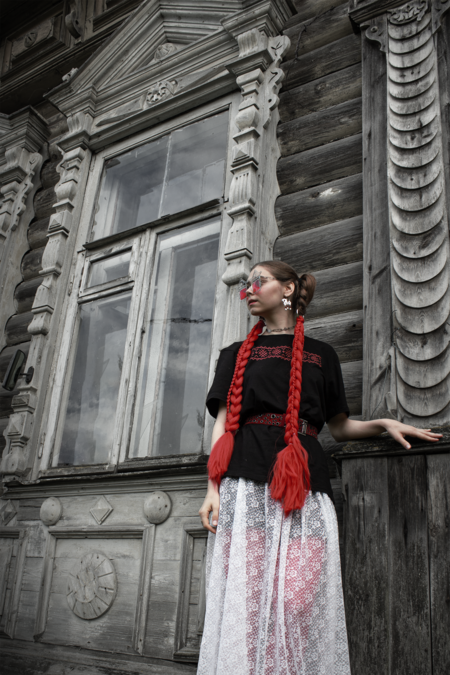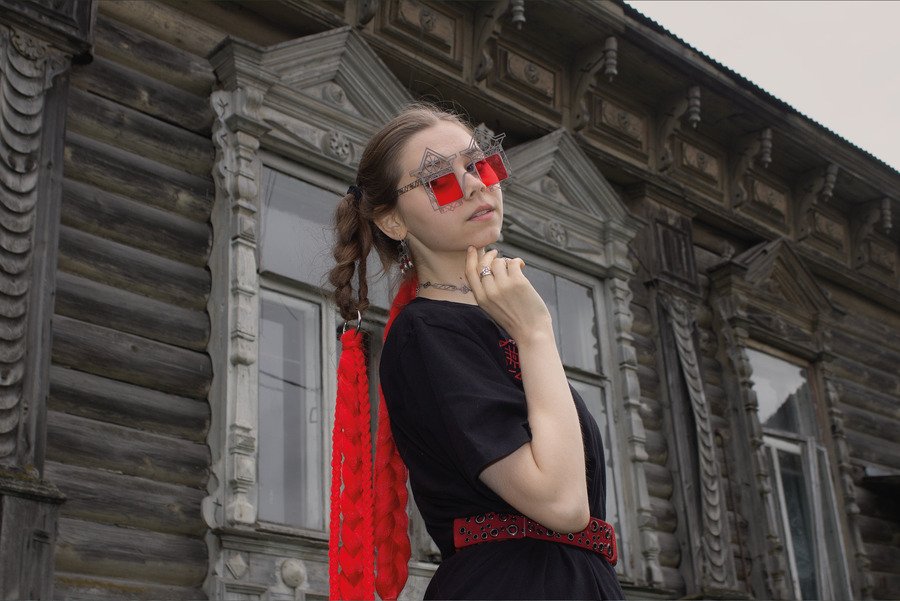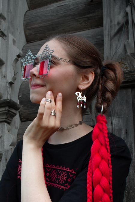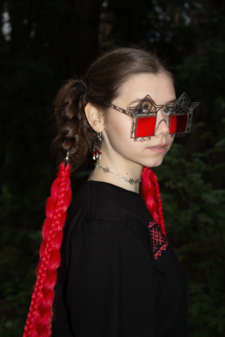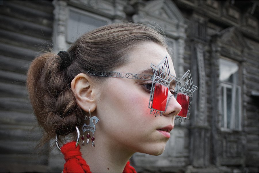 В традиционной культуре декоративные элементы избы несли сакральную функцию: охраняли дом, обозначали границу между внутренним и внешним. Я обращаюсь к этой фольклорной древности, соединяя её с жёсткой структурой техно-эстетики. Геометрия, металл и холодный блеск вступают в диалог с архаическими символами. Очки-наличники превращают лицо в фасад, а глаза — в окна.