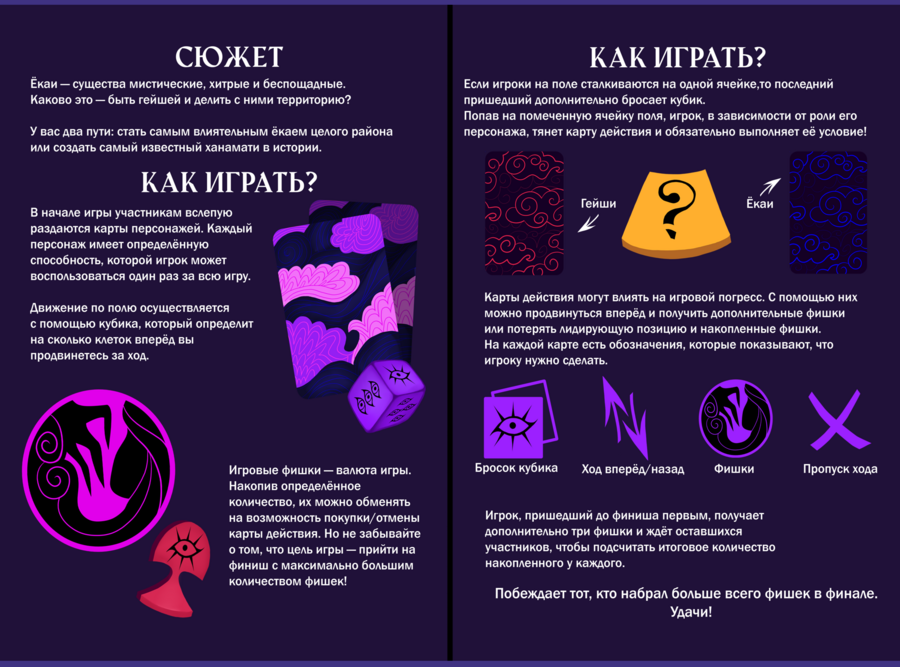 Цель игрока — добраться до финиша с наибольшим количеством фишек. Фишки можно получить с помощью карт действий. Для гейш и для ёкаев карты разные.