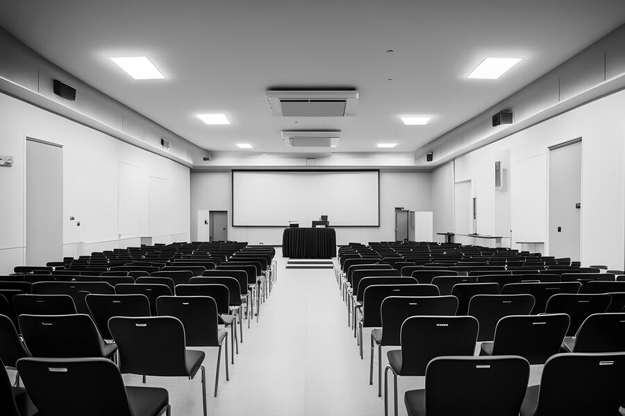 Prompt: lecture hall, many chairs and a podium stage, no natural light, interior in black and white colors