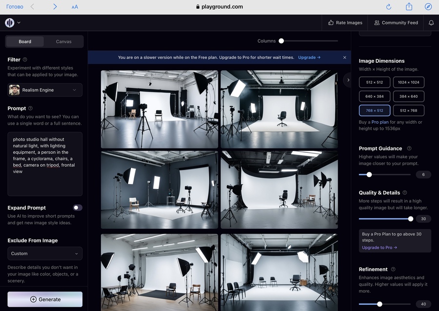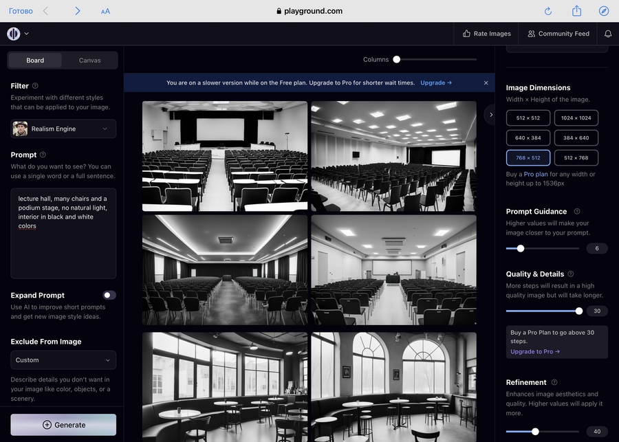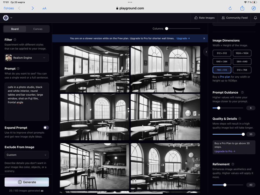 В оригинальном проекте предполагалось демонстрация лишь нескольких зон пространства, но с помощью нейросети playground.com родились концепт-рендеры кафе, лектория, и зала фотостудии.