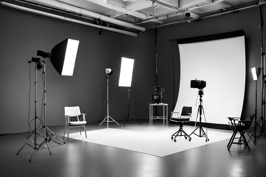 Prompt: photo studio hall without natural light, with lighting equipment, a person in the frame, a cyclorama, chairs, a bed, camera on tripod, frontal view