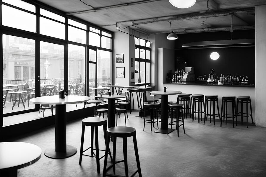 Prompt: cafe in a photo studio, black and white interior, round tables and bar counter, large window, shot on Fuji film, frontal angle