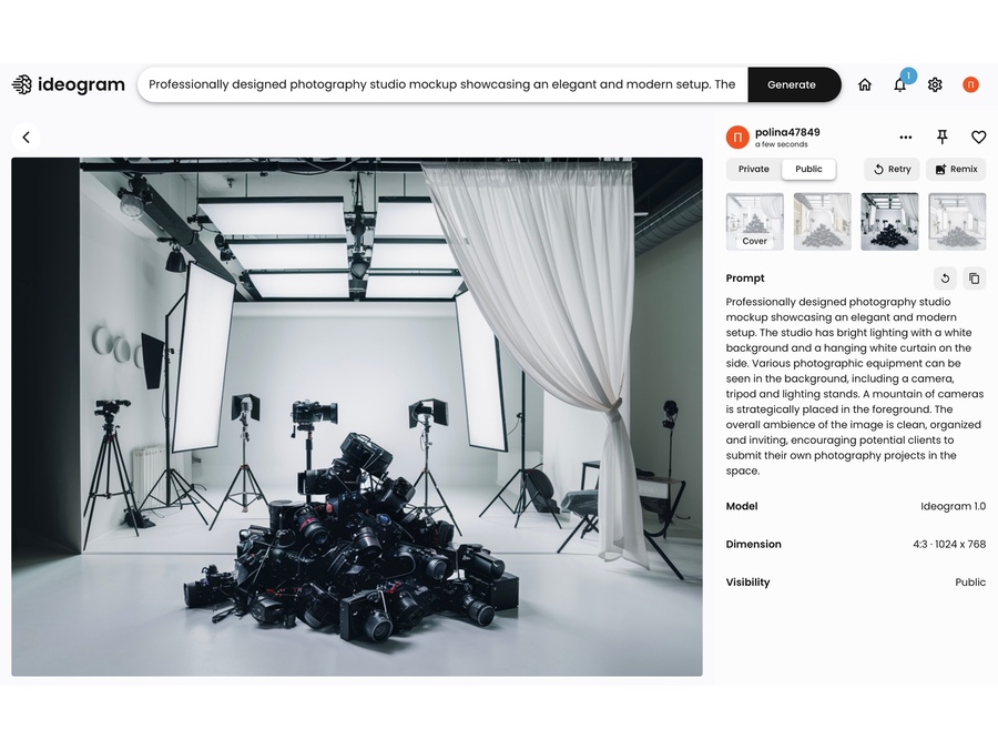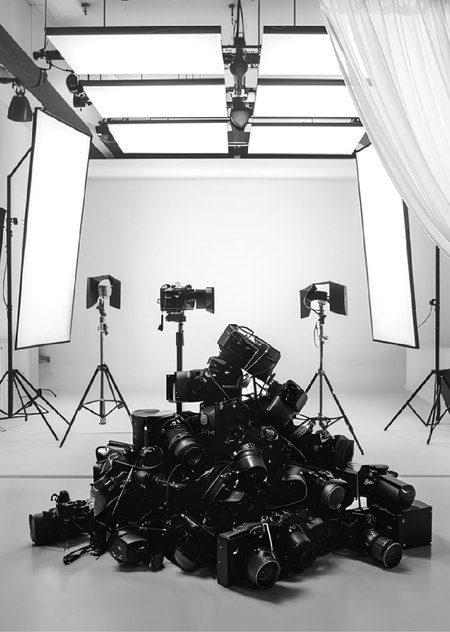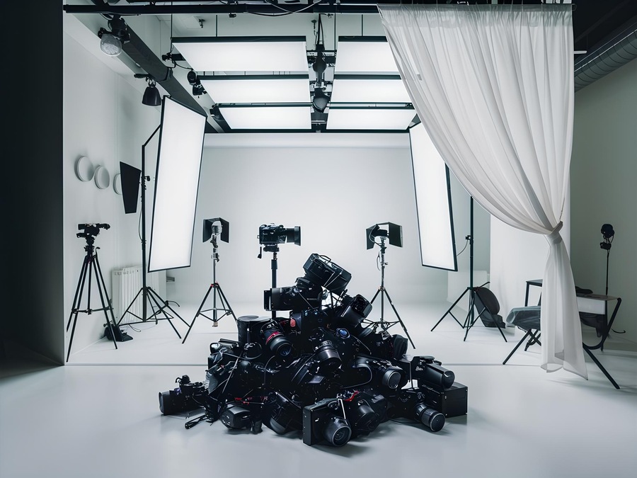 Prompt: Professionally designed photography studio mockup showcasing an elegant and modern setup. The studio has bright lighting with a white background and a hanging white curtain on the side. Various photographic equipment can be seen in the background, including a camera, tripod and lighting stands. A mountain of cameras is strategically placed in the foreground. The overall ambience of the image is clean, organized and inviting, encouraging potential clients to submit their own photography projects in the space