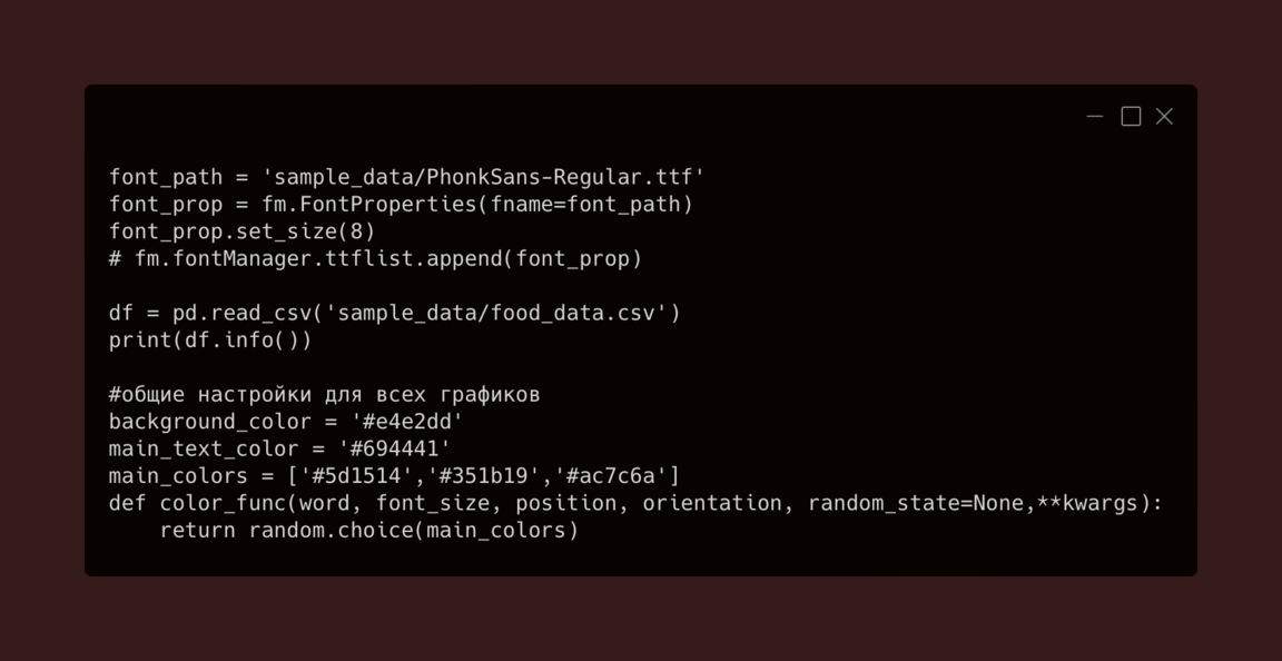Сначала я импортировала все необходимые библиотеки. После этого я настраиваю шрифт для визуализаций с помощью FontProperties, загружаю файл с данными из CSV с помощью pd.read_csv () и выводим информацию о структуре данных с помощью метода df.info (), чтобы понять, с какими столбцами и типами данных я работаю. Это помогает сразу оценить, насколько хорошо подготовлены данные для дальнейшей обработки и визуализации.