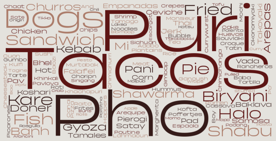 Первым шагом я решил посмотреть, какие ингредиенты наиболее часто встречаются в уличной еде разных стран.