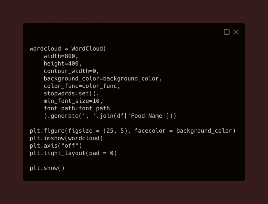 Здесь я создаю облако слов для отображения названий блюд, используя столбец Food Name. Процесс аналогичен первому облаку слов, но теперь отображаются именно названия блюд, а не ингредиенты.