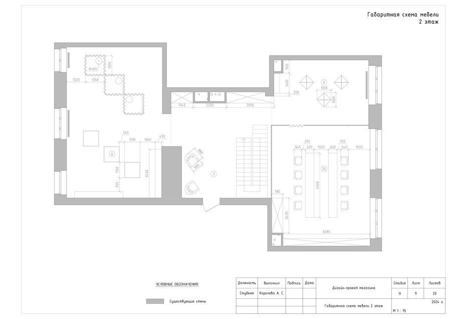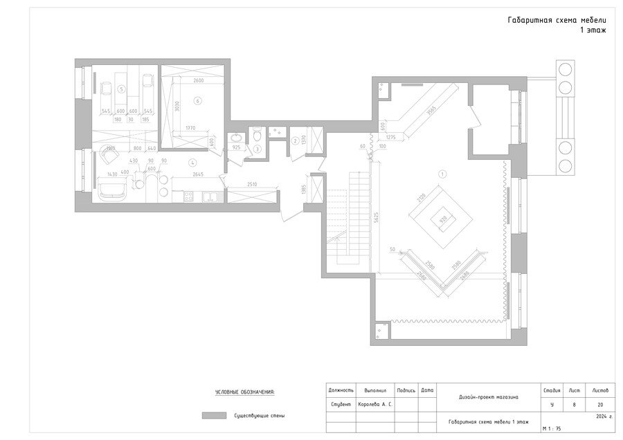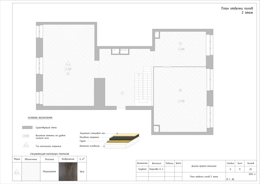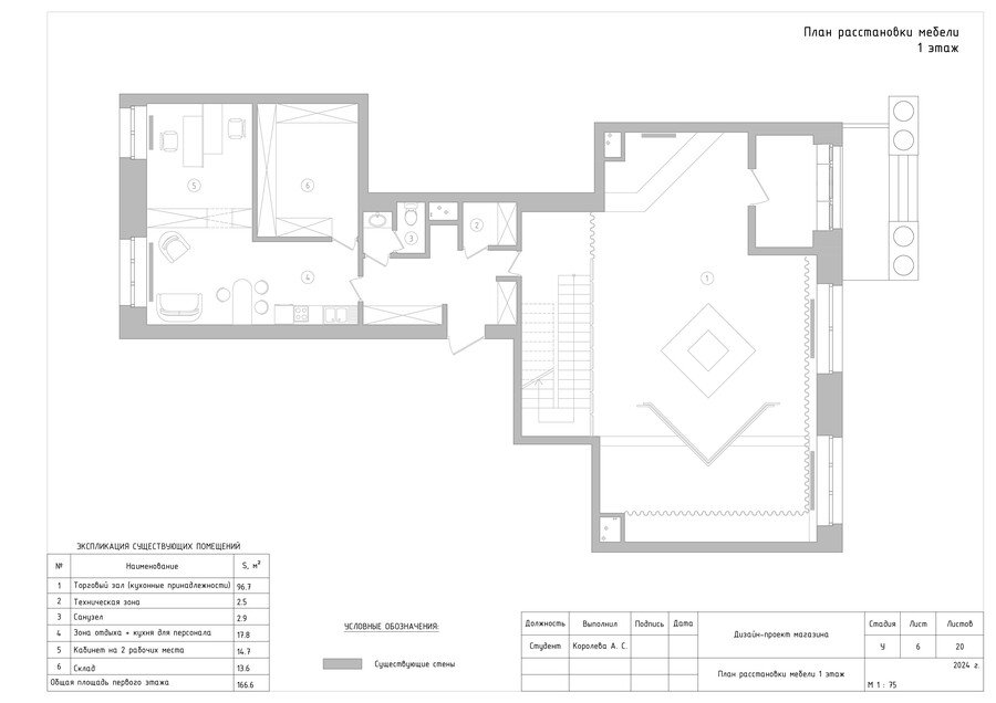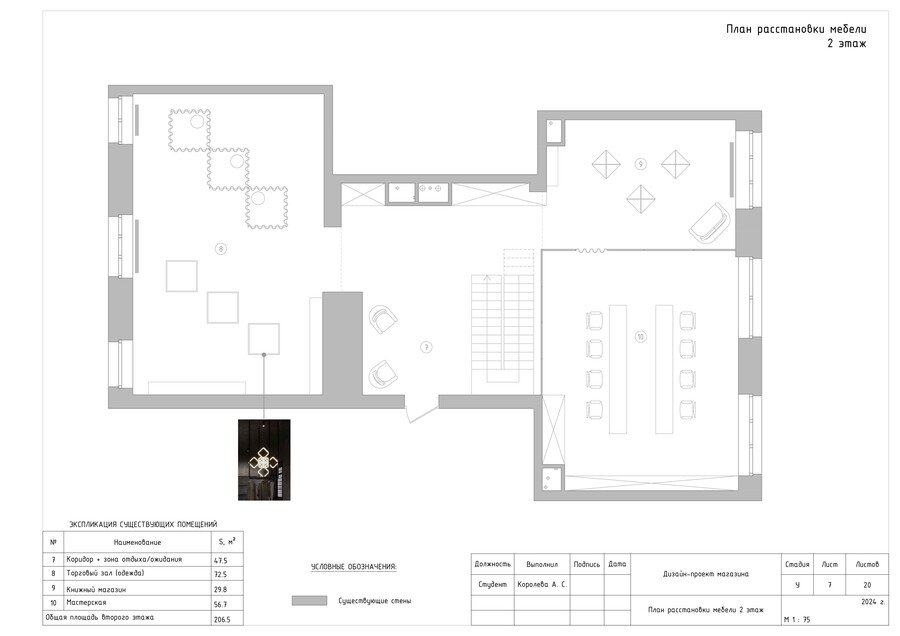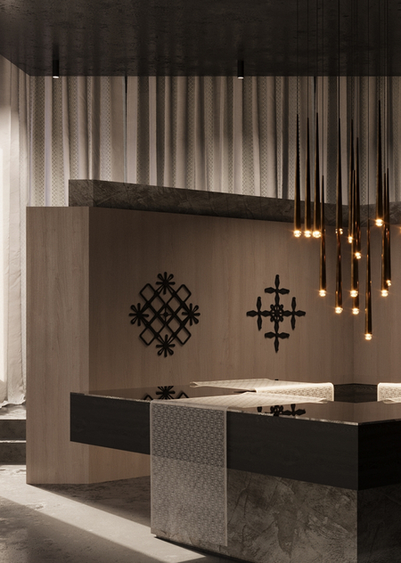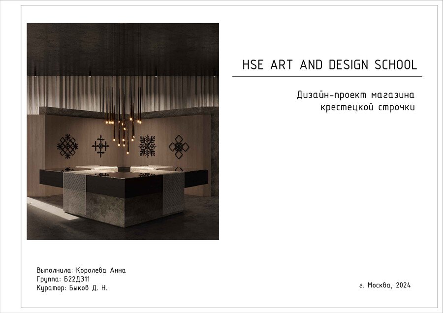 Пространство, где традиции вышивки сочетаются с современным дизайном. В планировочном решении и дизайне интерьера шоурума присутствуют элементы и узоры, используемые в крестецкой вышивке. Они наполняют пространство языческим символизмом и сакральностью. Темные тона интерьера создают контраст с продукцией, выполненной в белом и бежевом цветах (лен и хлопок), что подчеркивает красоту и уникальность каждой вещи.