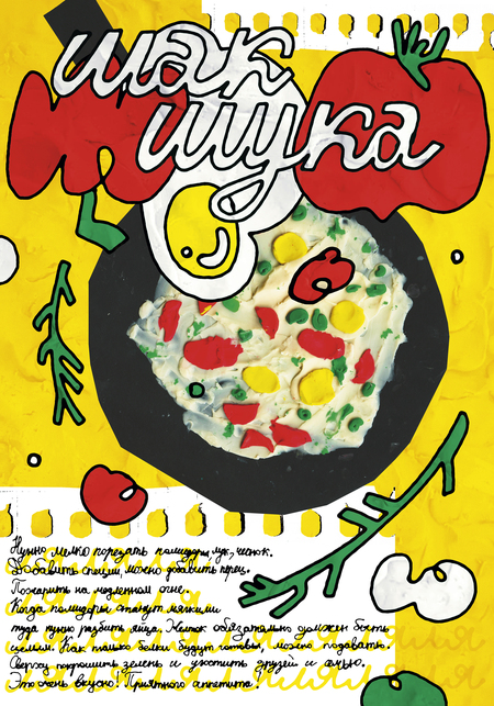 Плакат о традиционном блюде еврейской кухни — шакшуке. Рецепт и пластилиновый рисунок были выполнены учащимися школы для мальчиков при Еврейском музее.