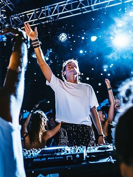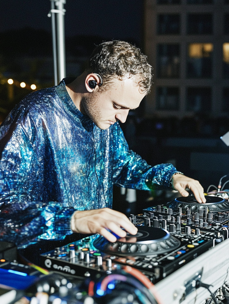 prompt: Close-up of a DJ dancing at an open-air electronic music festival at night. Sweat dripping, intense expression, focused on the music. Hard light, bright flash, film grain, photorealism, 8k --ar 3:4 --style raw —sref https://gochromic.hb.ru-msk.vkcs.cloud/361185450/sref/6896c275eda7a30dc1f8404f58c84b3d.png
