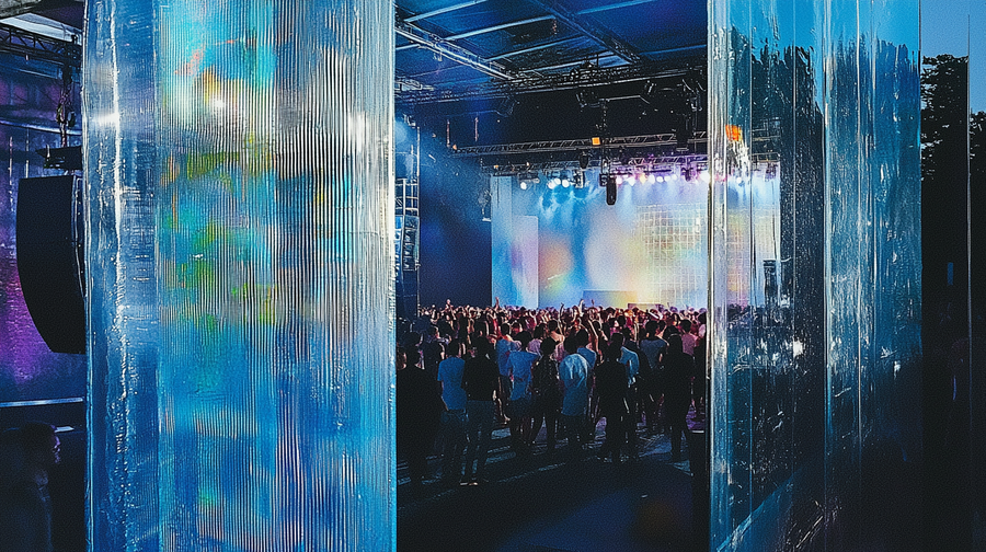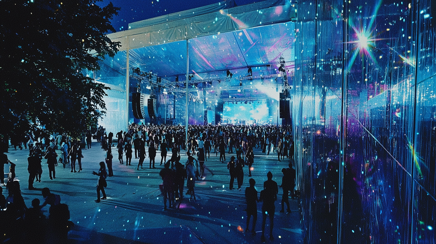 prompt: Panoramic view of an open-air electronic music festival at night. Thousands of dancing people, illuminated stage, colorful light rays in the sky. Photorealism, film grain, shallow depth of field, 8k --ar 16:9 --style raw —sref https://gochromic.hb.ru-msk.vkcs.cloud/361185450/sref/6896c275eda7a30dc1f8404f58c84b3d.png