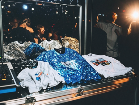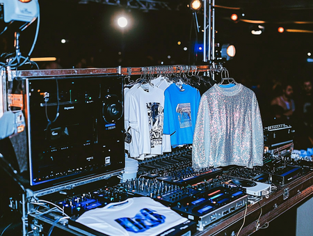 prompt: Close-up shot of a stack of band t-shirts on a metal merch table at a night-time electronic music festival. The shirts feature bold graphics and logos. Hard light, bright flash, film grain, photorealism, 8k --ar 4:3 --style raw —sref https://gochromic.hb.ru-msk.vkcs.cloud/361185450/sref/dcc3782f2fc4f9bc63a4541f7c52c9b7.png