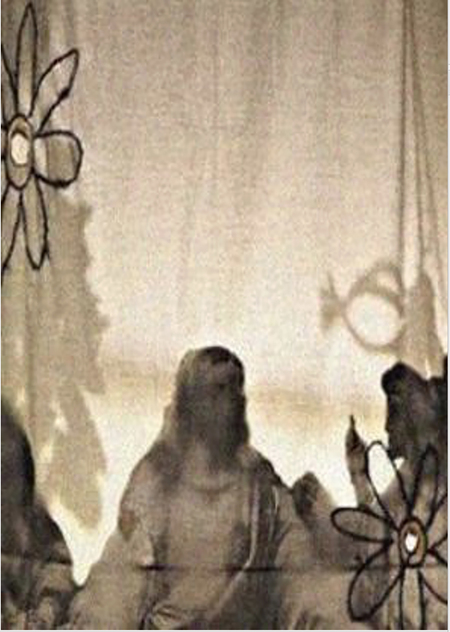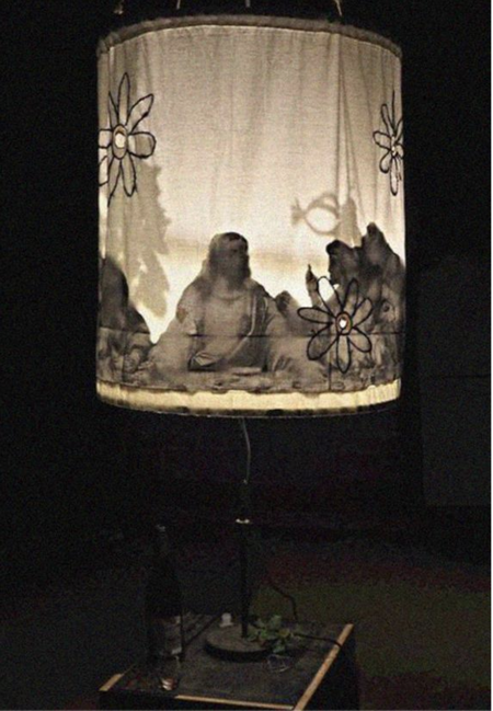 ТАЙНАЯ ВЕЧЕРЯ 2022 Работа строится на символах: Расплывчатая печать на бумаги, повторяющая картину «Тайная вечеря» Леонардо Да Винчи — символ дружбы, сплоченности и предательства. Сам внешний вид ночника с кружащими тенями — дом, уют, покой, но тени каждый воспринимает по своему. Музыка всегда воспринимается по разному — для кого-то она умиротворяющая, для кого-то тревожная, особенно если она повторяется снова и снова, и снова. Бутылка вина и стаканчик, с одной стороны праздник с другой зависимость.