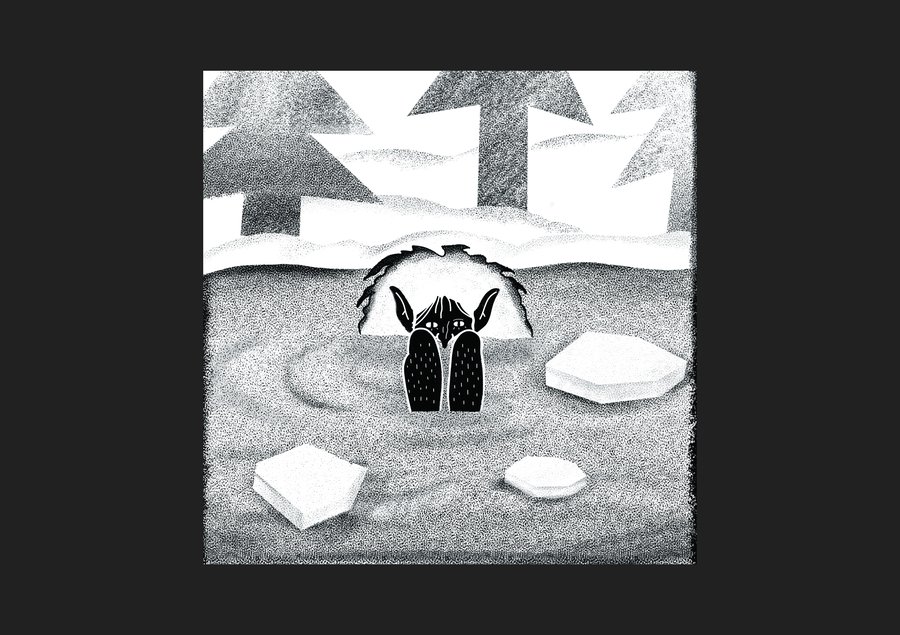 prompt: digital drawing with charcoal texture of a frost-covered creature standing silently on a frozen lake beneath dark skies
