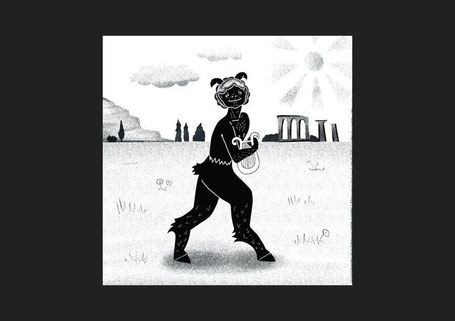 prompt: digital drawing with charcoal texture of a cheerful satyr playing a lyre under the sun near ancient ruins and cypress trees