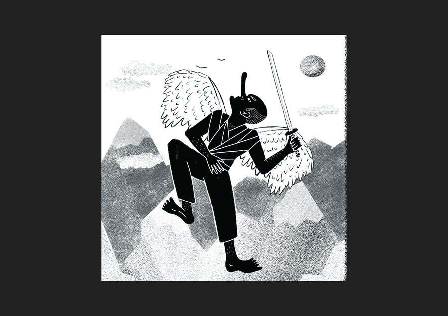 prompt: digital drawing with charcoal texture of a winged human with a sword standing triumphantly on mountain peaks under a bright sun